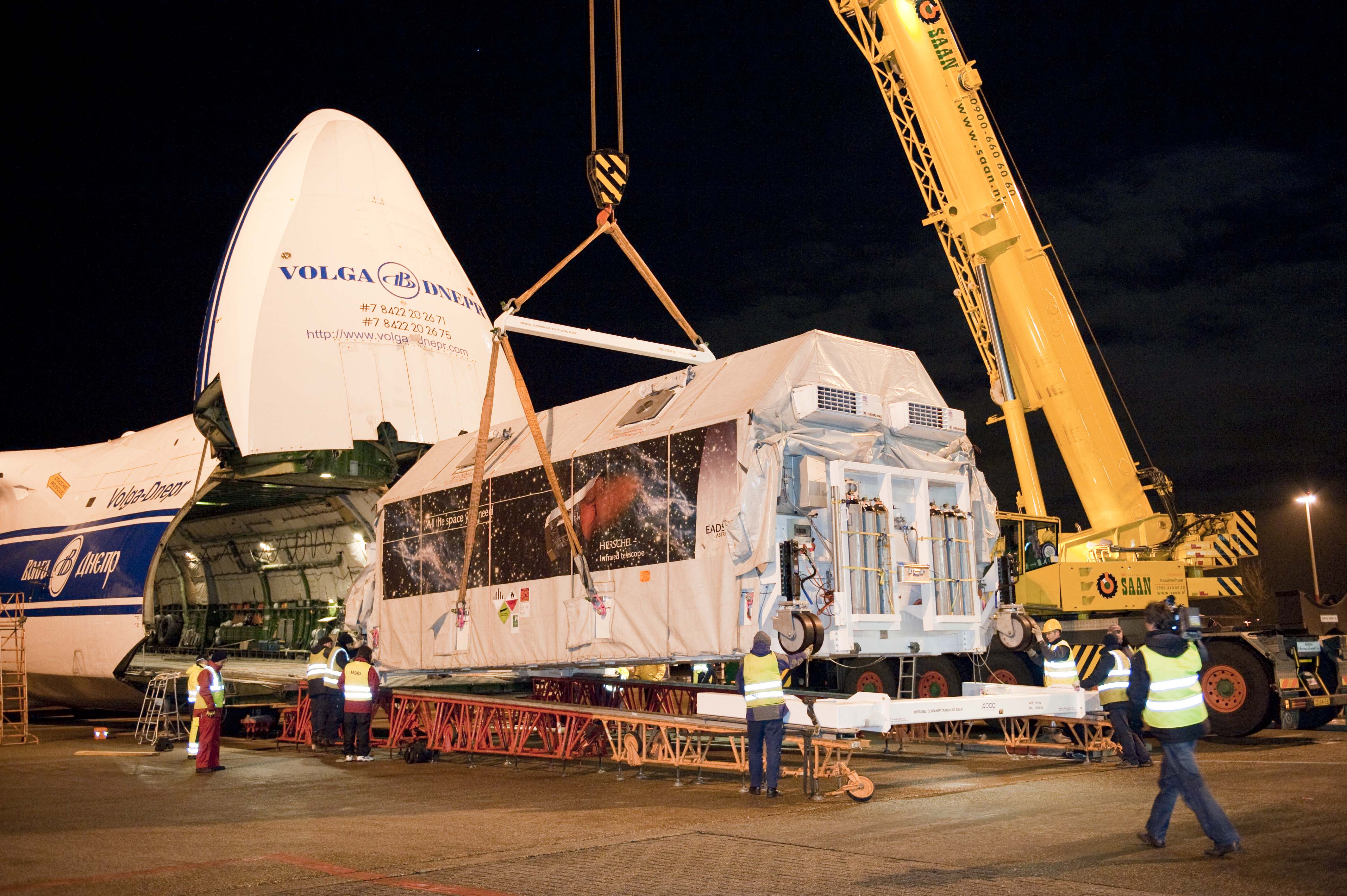 Depicts: Loading of the container with Herschel onto an Antonov plane