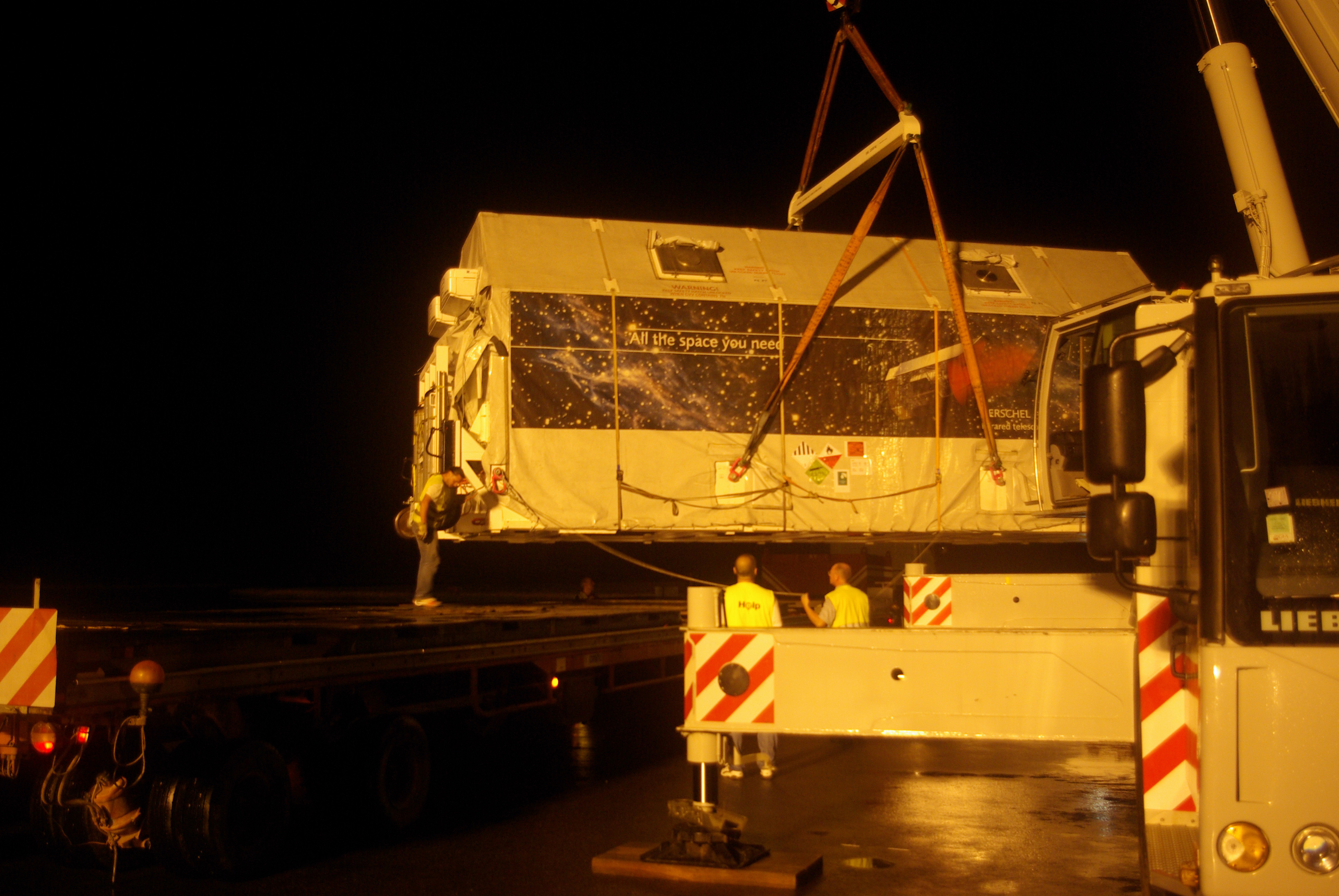 Depicts: The custom-built Herschel container is moved by crane