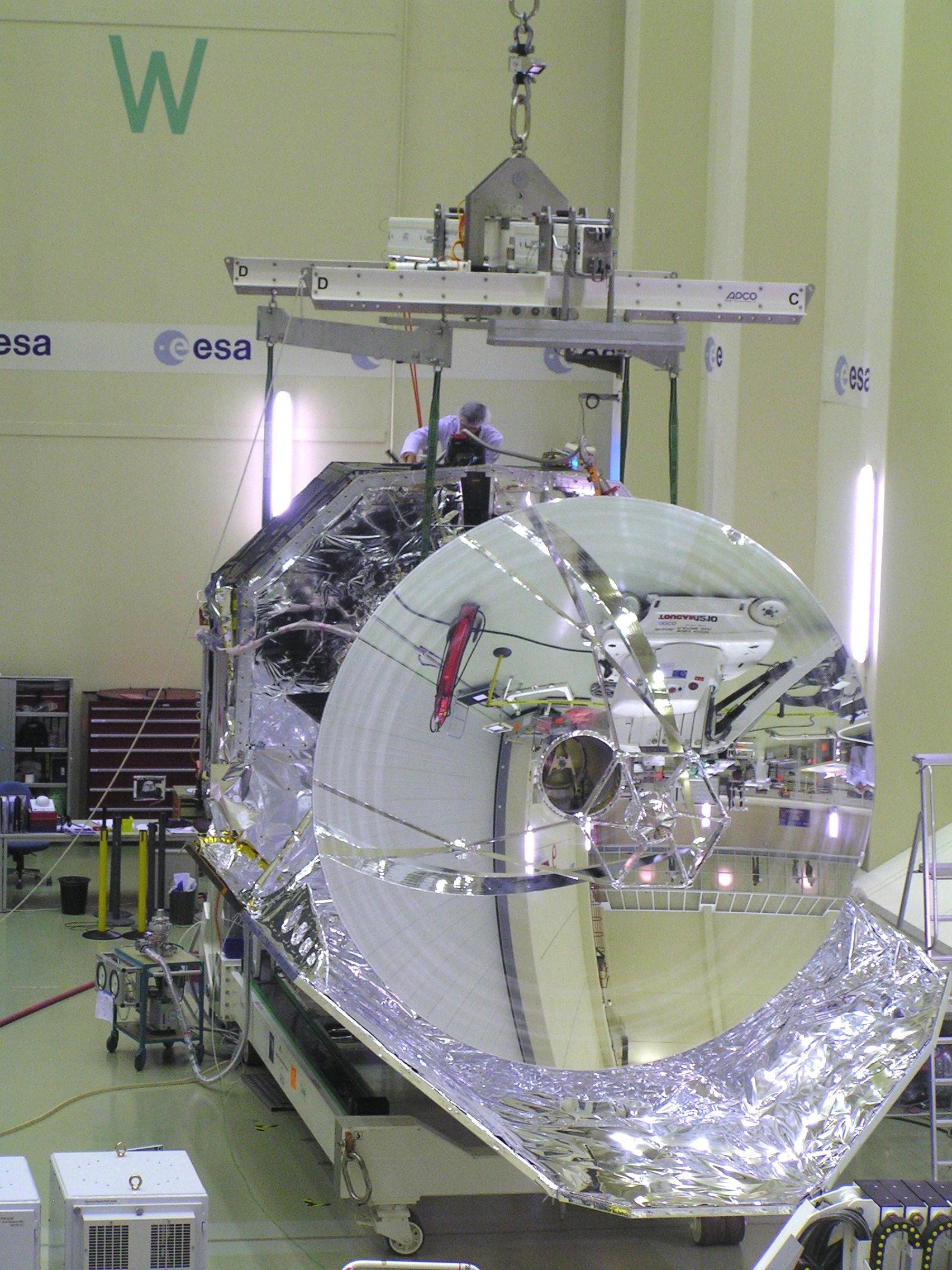 On Thursday 29 January 2009, the first activities for the forthcoming transport and shipment of the Herschel spacecraft to Kourou were performed with the securing of Herschel onto the lower part of its transport container.