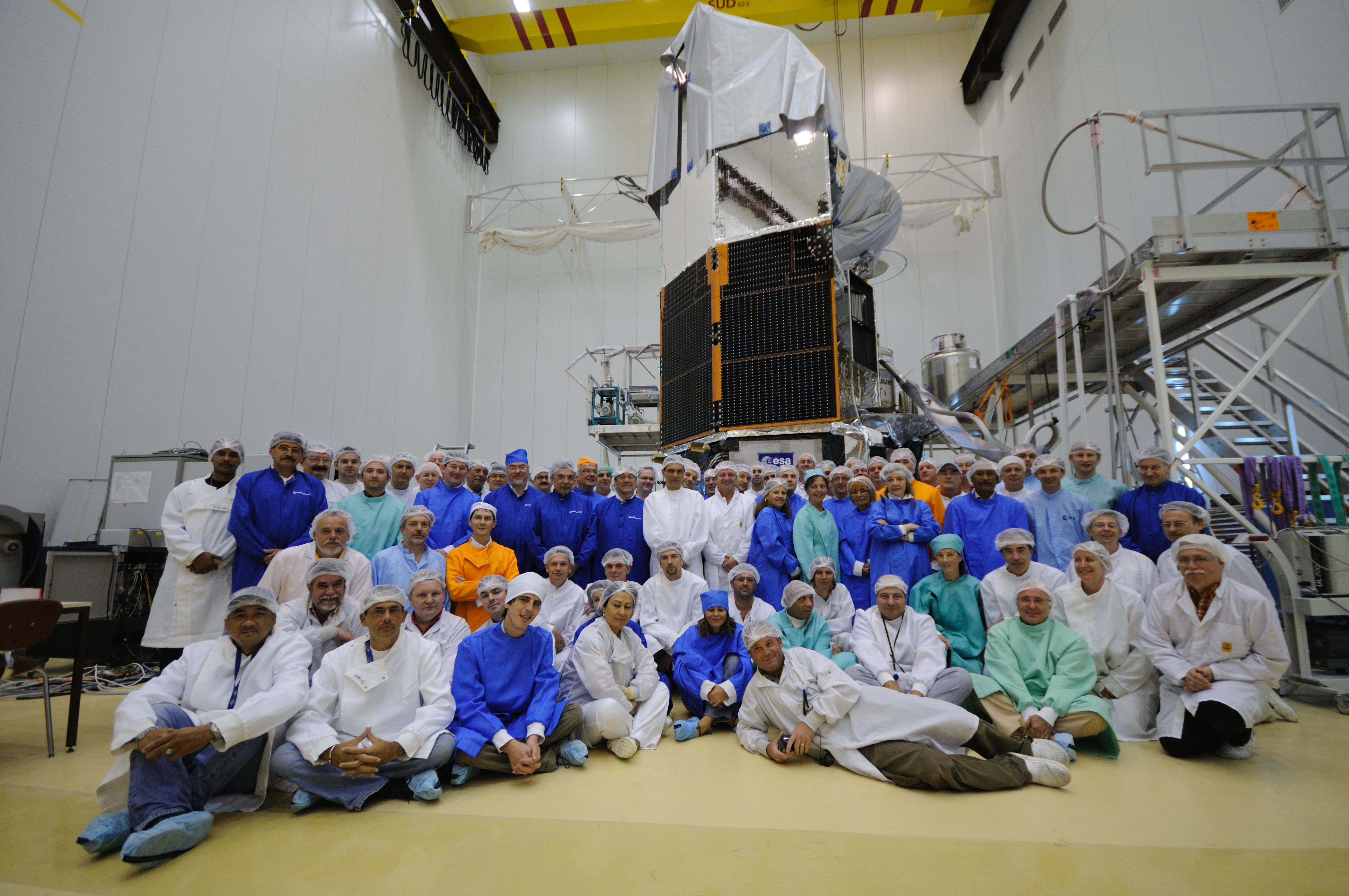 Depicts: Launch campaign team in front of the flight model spacecraft