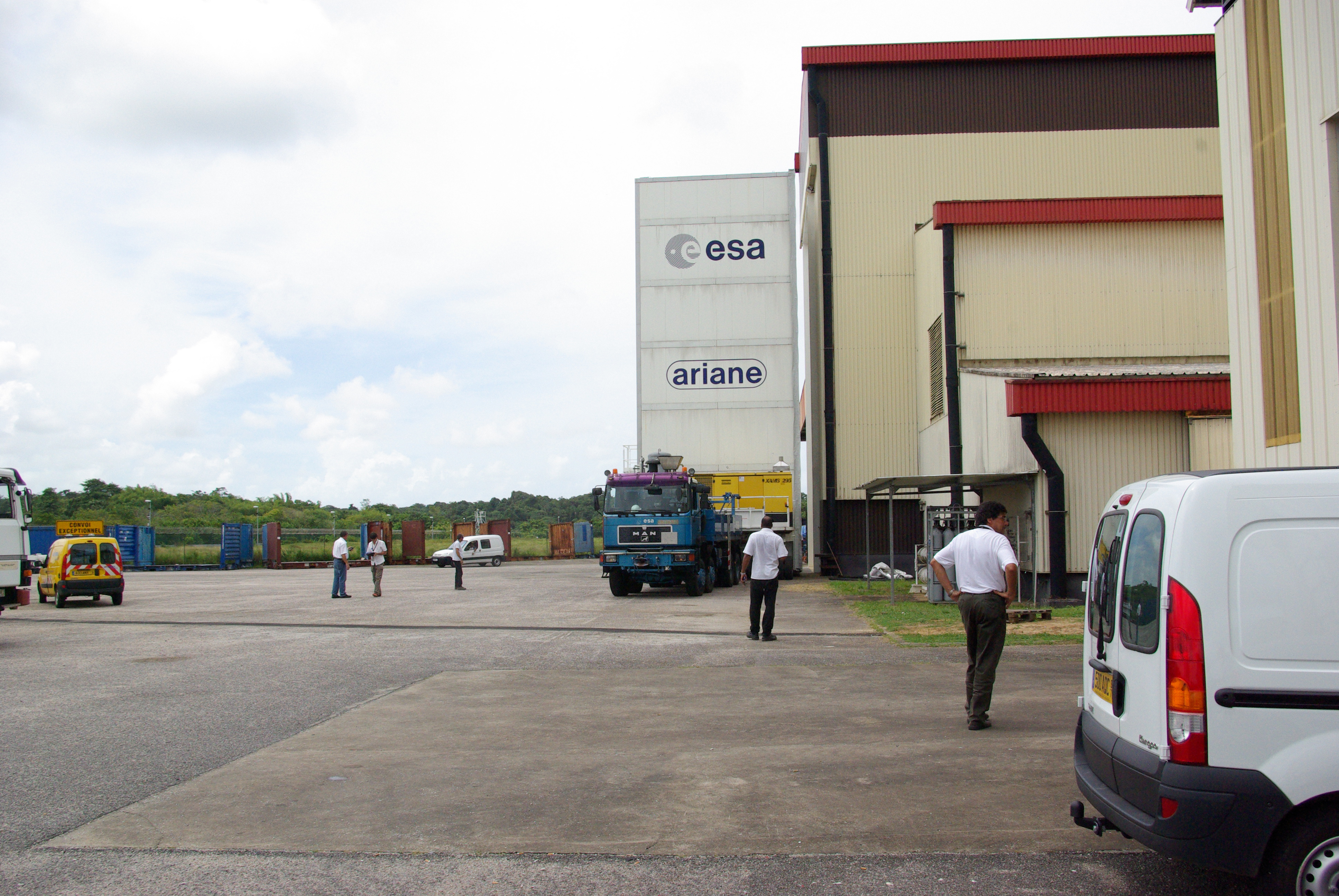 Date: 09 April 2009 Satellite: Herschel Depicts: The CCU containing Herschel Location: Outside the S1B building at CSG, Kourou, French Guiana Copyright: ESA Show in archive: true