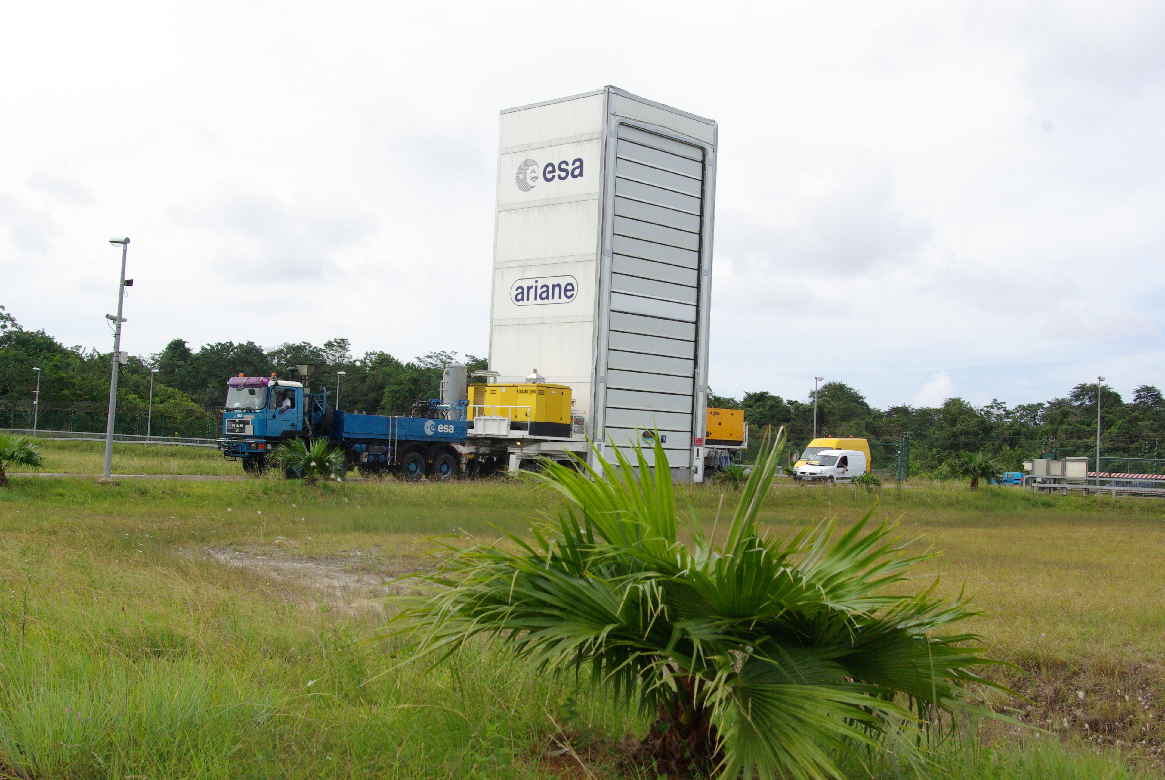 The CCU (Conteneur Charge Utile; payload transport container) containing the Herschel spacecraft travelled the 5 km from S1 to S5 in convoy. Functional testing of the spacecraft was performed in the S1 building; the Hydrazine fuelling is done in the S5 building.