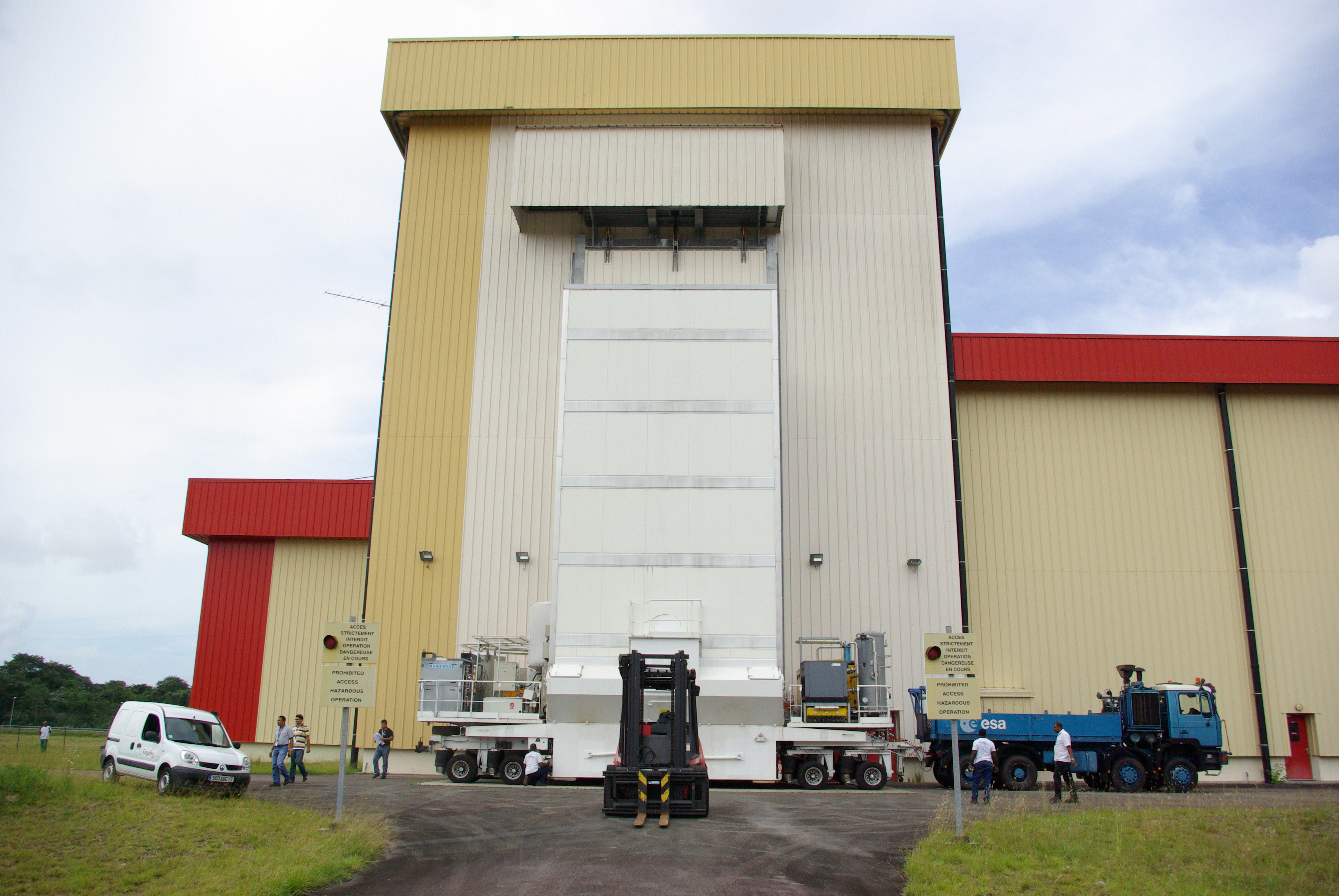 Date: 09 April 2009 Satellite: Herschel Depicts: Arrival of Herschel at S5B Location: Outside the S5B building at CSG, Kourou, French Guiana Copyright: ESA Show in archive: true