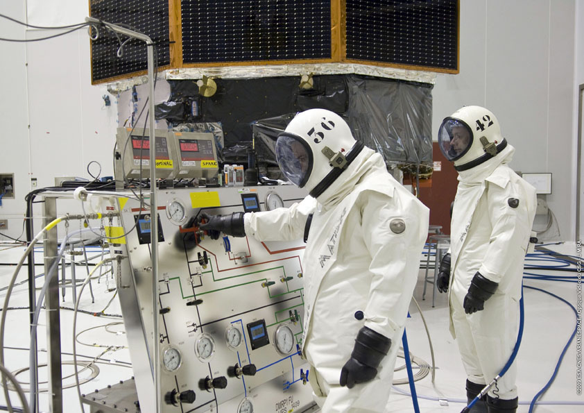 Operators in scape suits make adjustments to the monitoring equipment in preparation for the hydrazine fuelling activities for the Herschel spacecraft.