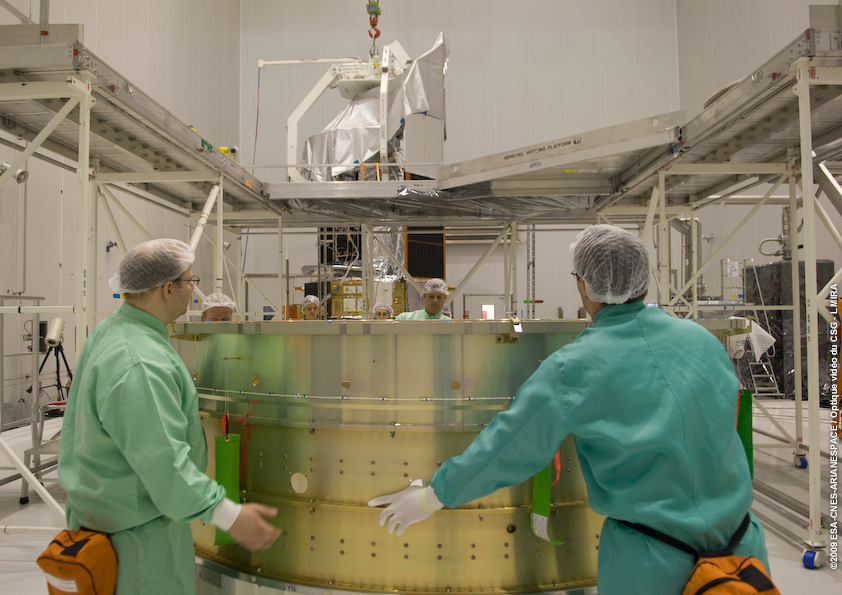 Depicts: The launcher adapter ring (Adapteur Charge Utile, or ACU) ready for the Herschel spacecraft