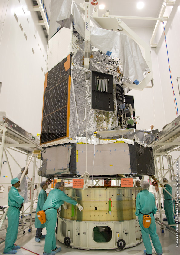 Depicts: The Herschel spacecraft being integrated with the launcher adapter