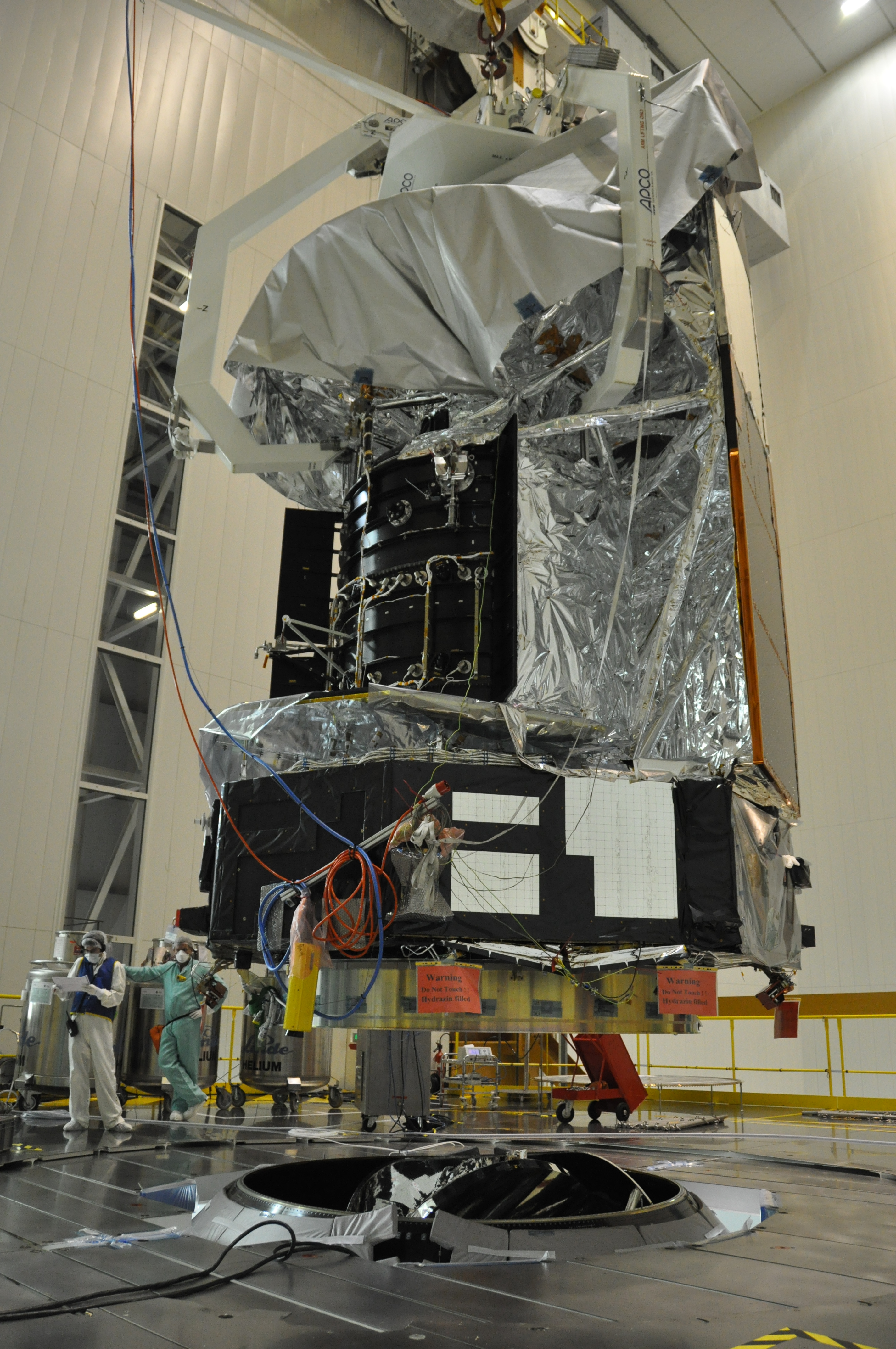 The Herschel spacecraft is lowered into place on top of the SYLDA 5 support structure at the top of the Ariane 5 ECA launcher inside the final assembly building (Bâtiment d'Assemblage Final, or BAF).