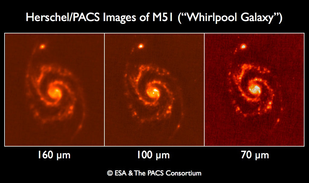 Far-infrared image of M 51, the whirlpool galaxy at three different wavelengths (160, 100 and 70 microns) , taken by the Herschel Photoconductor Array Camera and Spectrometer, PACS.
