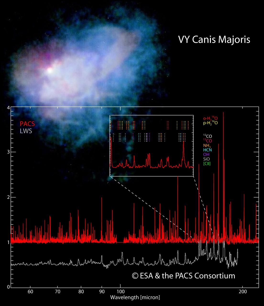 This is one of the early spectra obtained with the PACS integral field spectrometer on Herschel. Shown here (in red) is the spectrum of the red supergiant VY CMa between 50 and 210 micron. Depicted in gray, and offset by -0.5, is the observation from the ISO Long Wavelength Spectrometer (LWS). The inset shows a zoom into the 156 to 172 micrometer wavelength range. In this short wavelength region, 44 different molecular lines are identified (indicated by coloured thick marks). In the background is an optical and near-infrared image from the Hubble Space Telescope.