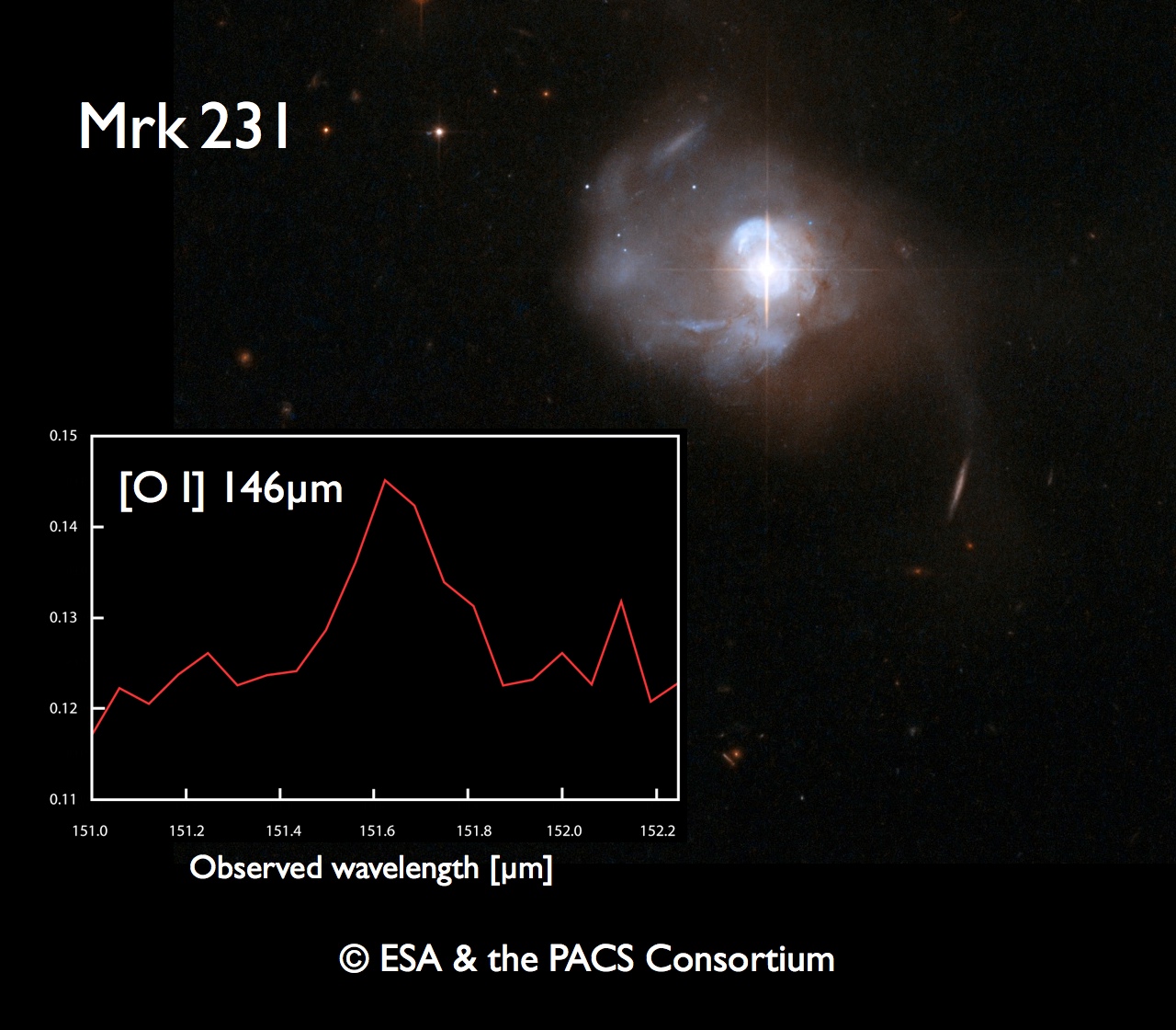 This is one of the early spectra obtained with the PACS integral field spectrometer on Herschel. Shown here is a spectral scan of one of the emission lines detected by PACS in the Ultraluminous Infrared Galaxy (ULIRG) known as Markarian 231.