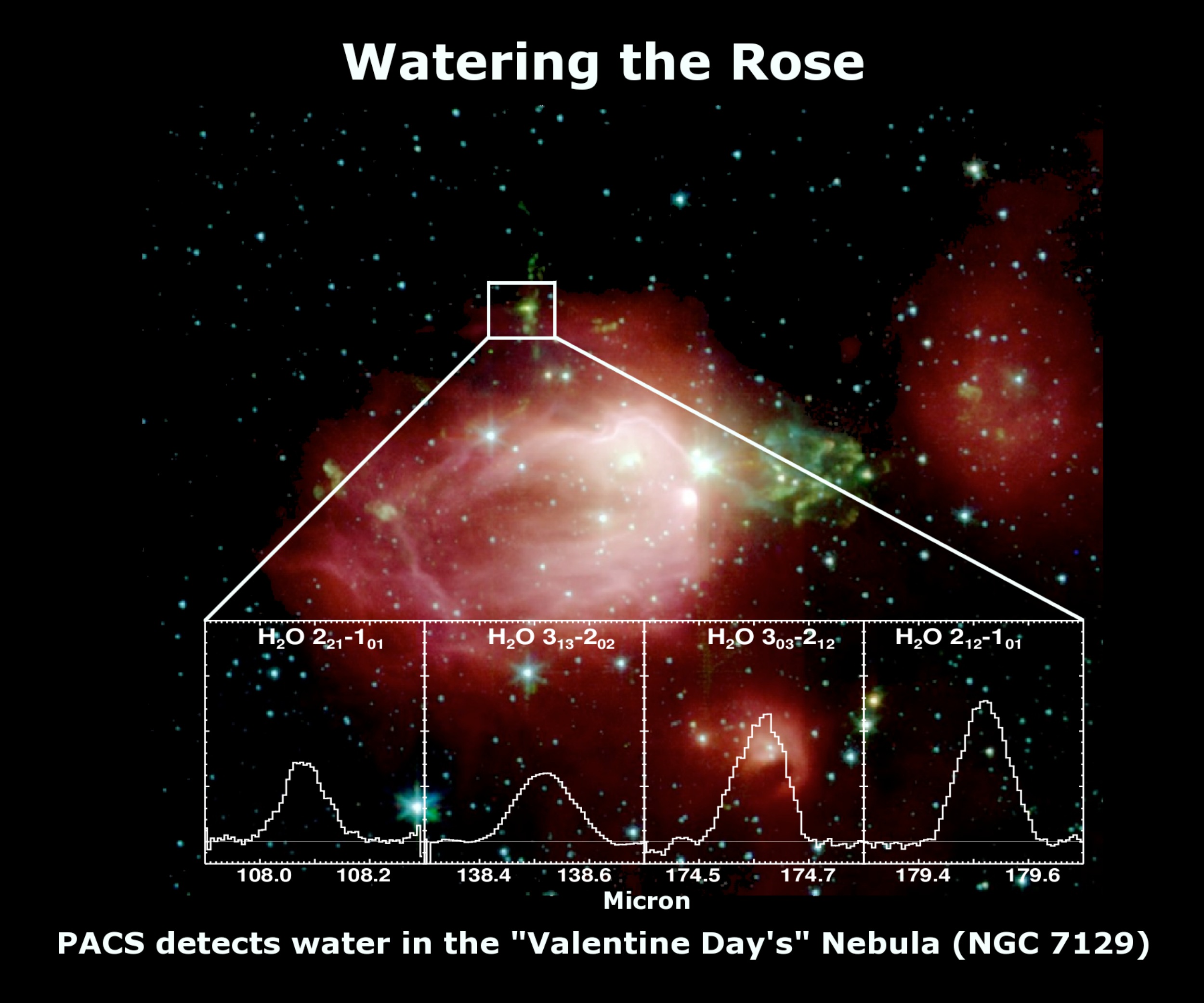 PACS spectra of various strong fingerprints of water toward the embryonic star NGC 7129. The background image is the 'Valentine day' ('Rose') nebula - a