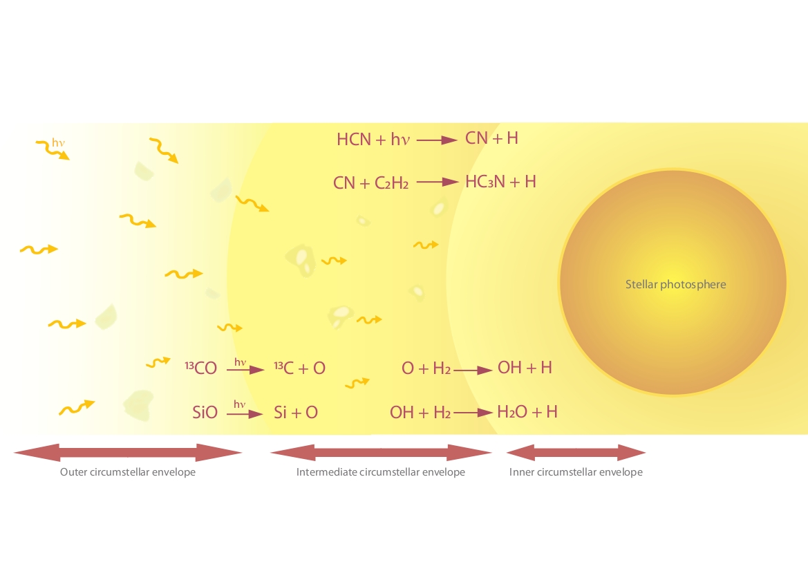 This figure illustrates some of the chemical processes that occur in the envelope surrounding a carbon-rich Asymptotic Giant Branch (AGB) star. Ultraviolet (UV) photons penetrating the clumpy envelope trigger a set of chemical reactions that liberate oxygen, which is locked up in molecules of carbon monoxide (CO) and silicon monoxide (SiO), and result in the production of water vapour (H2O).