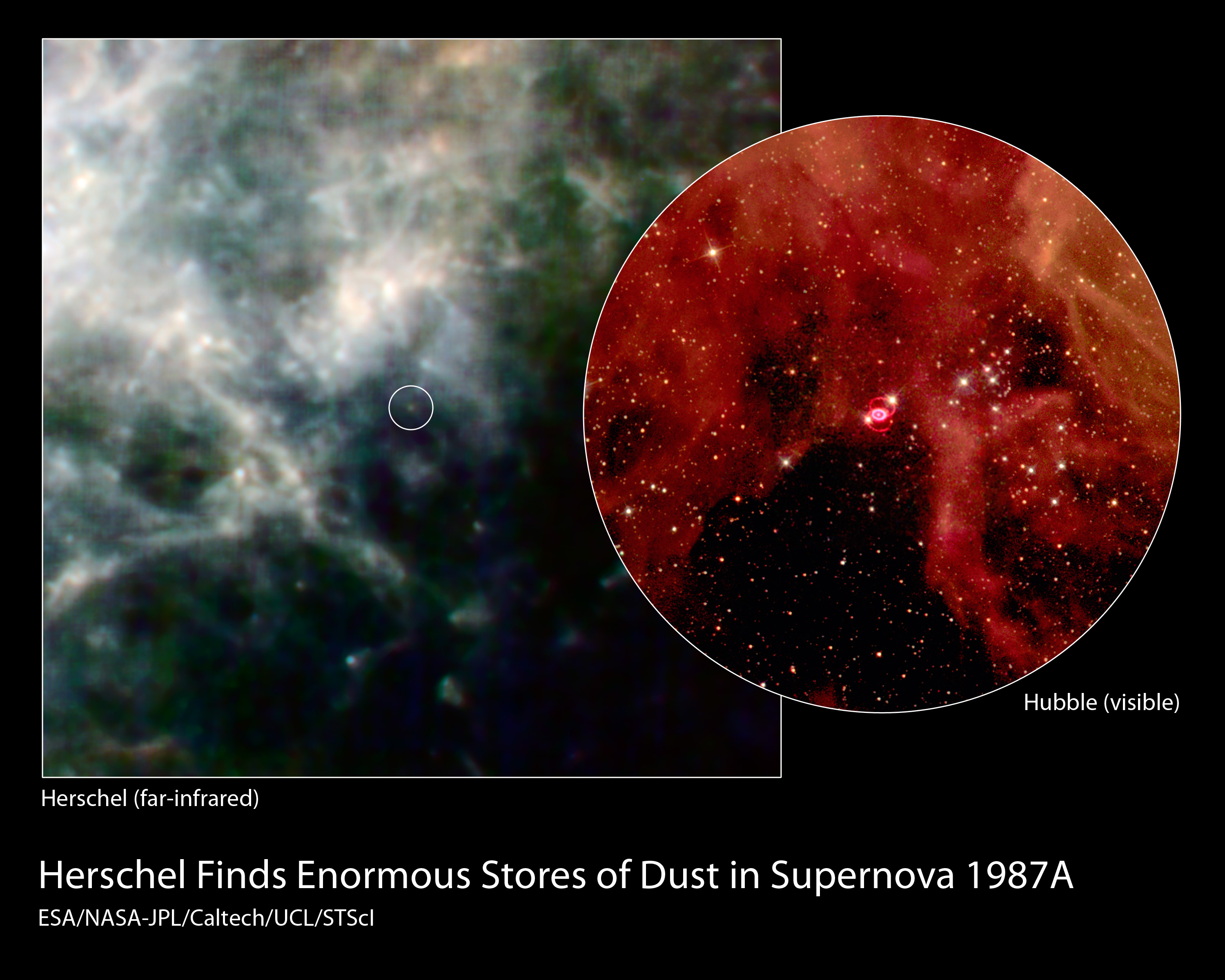 The detection of SN1987A with Herschel demonstrates that this object contains an amount of dust nearly equivalent to the mass of the Sun and roughly 1000 times larger than what was previously believed. At temperatures of 16–23 Kelvin, the newly discovered component is about 20 times colder than any dust detected in the past in this supernova remnant.