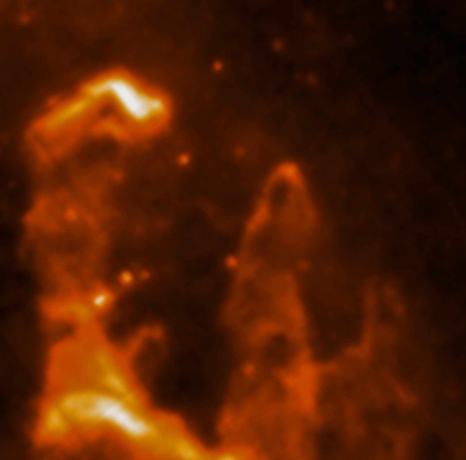 Up to 1998 the ESA ISO (Infrared Space Observatory) was the most sensitive mid infrared telescope ever built. ISO observations were performed at 7 microns (and 15 microns, not shown) aiming to detect embedded sources in the pillars.