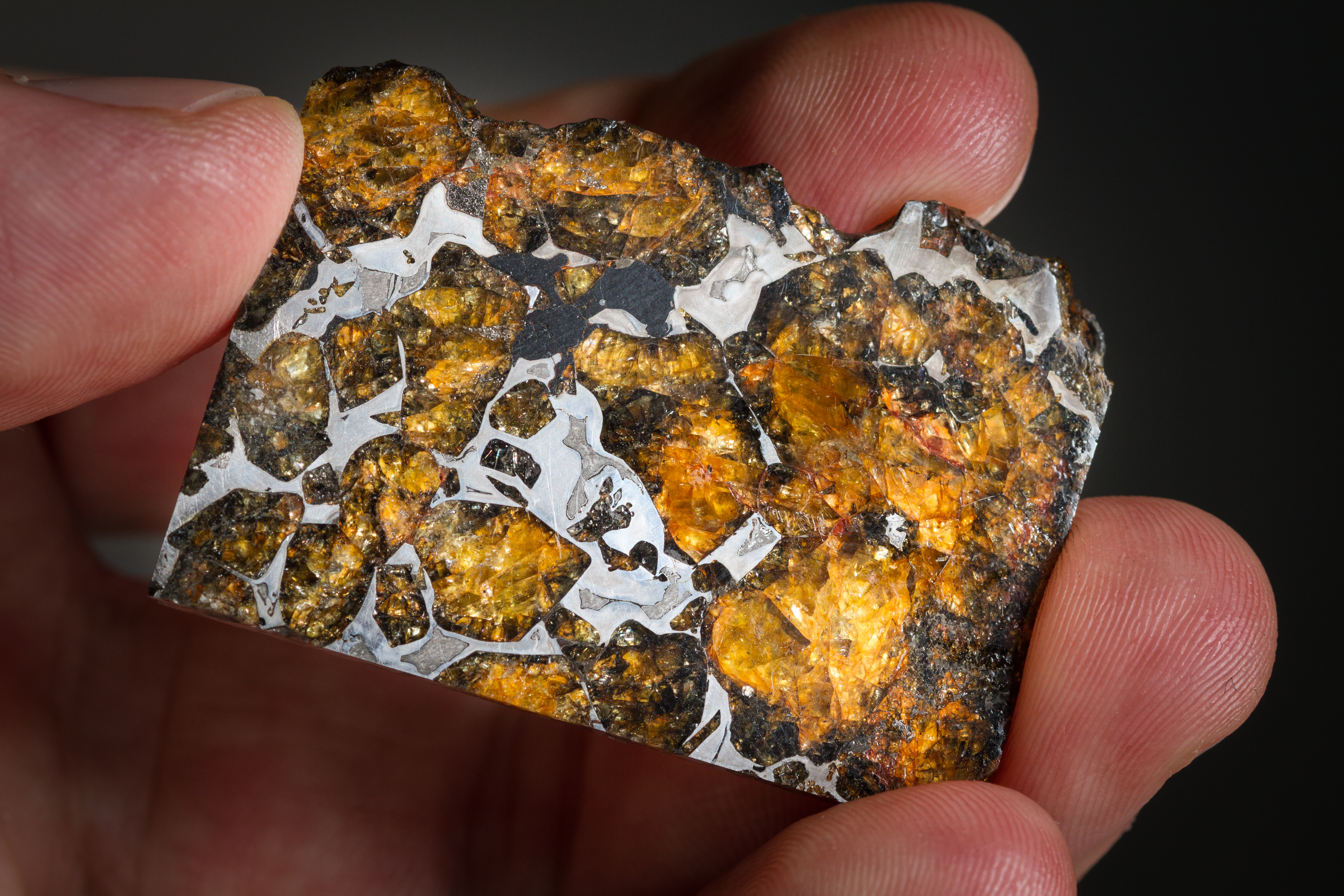 Close-up of olivine crystals seen inside a meteorite found on Earth that originated from a partly melted Solar System asteroid. The yellow olivine crystals are on the order of a few millimetres to centimetres in size and are held together by an alloy of iron and nickel. In contrast, the olivine crystals found in pristine comets, such as in the material measured in the Beta Pictoris system by ESA's Herschel space observatory, are iron-poor but magnesium-rich.