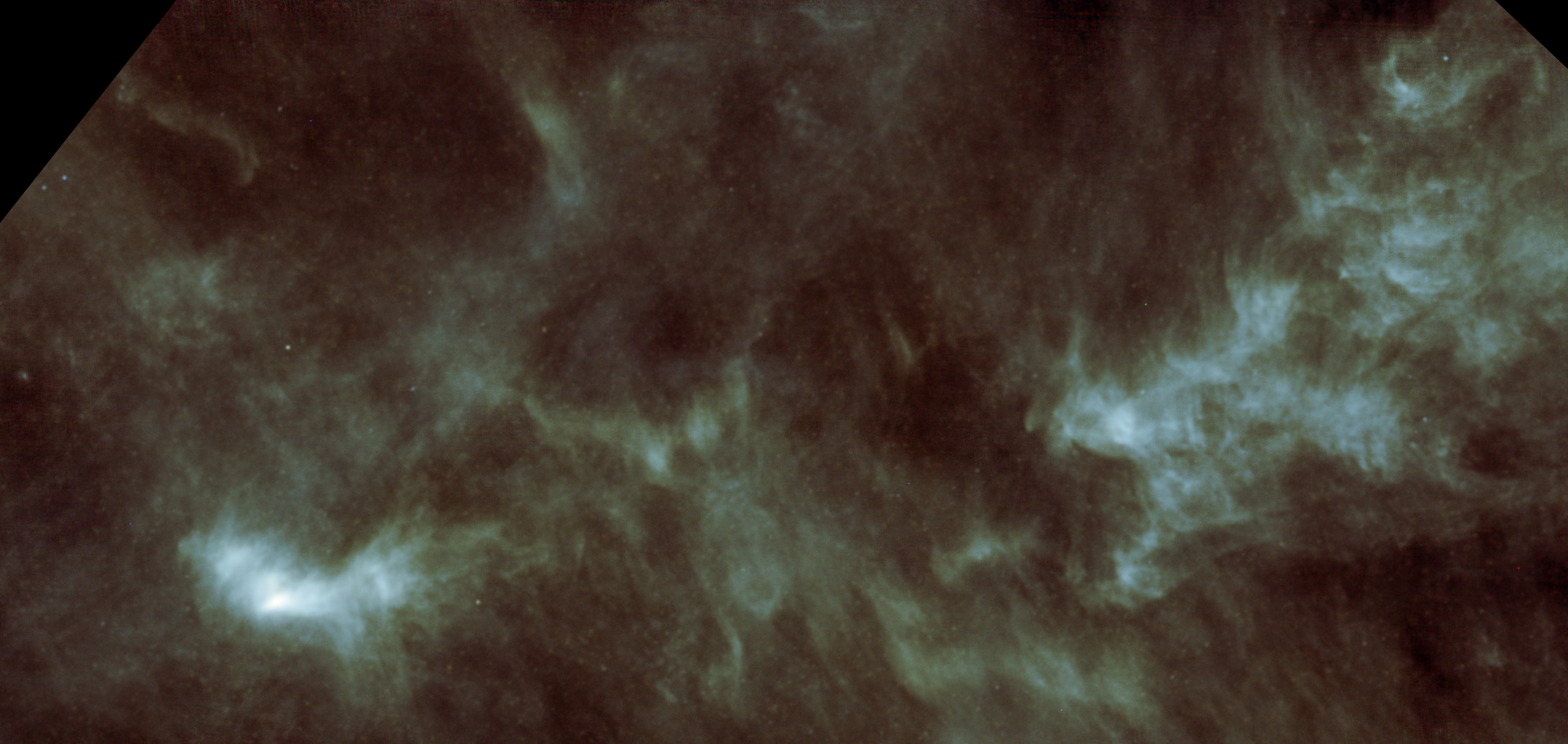 Herschel's infrared view of part of the Taurus Molecular Cloud, within which the bright, cold pre-stellar cloud L1544 can be seen at the lower left. It is surrounded by many other clouds of gas and dust of varying density.