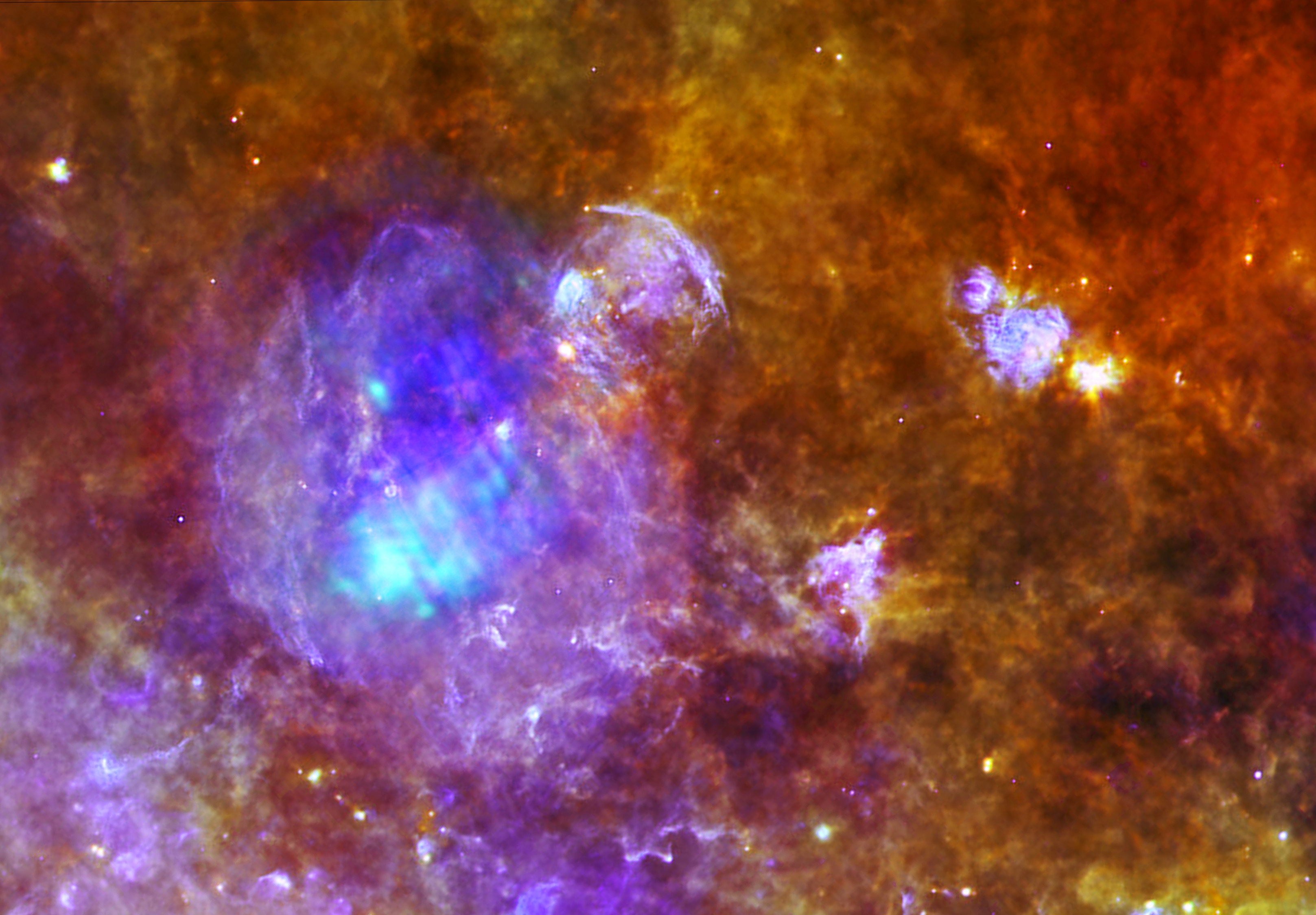 This image shows a composite view of supernova remnant W44 (SNR W44), a prime example of the interaction between the remains of a supernova and the dense interstellar material around it. The composite image is based on data from ESA's Herschel and XMM-Newton space observatories, which observed the source at far-infrared and X-ray wavelengths, respectively.
