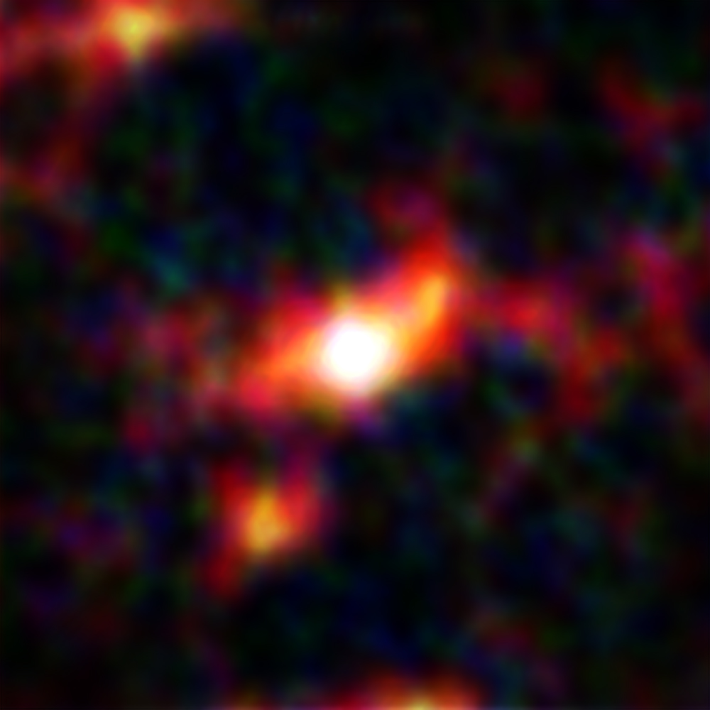 There are also background, extragalactic sources visible in the image: these are the tail-like feature, visible in yellow/red to the right of the disc, and the yellow/red objects to the lower left of the disc and in the upper left corner of the image.