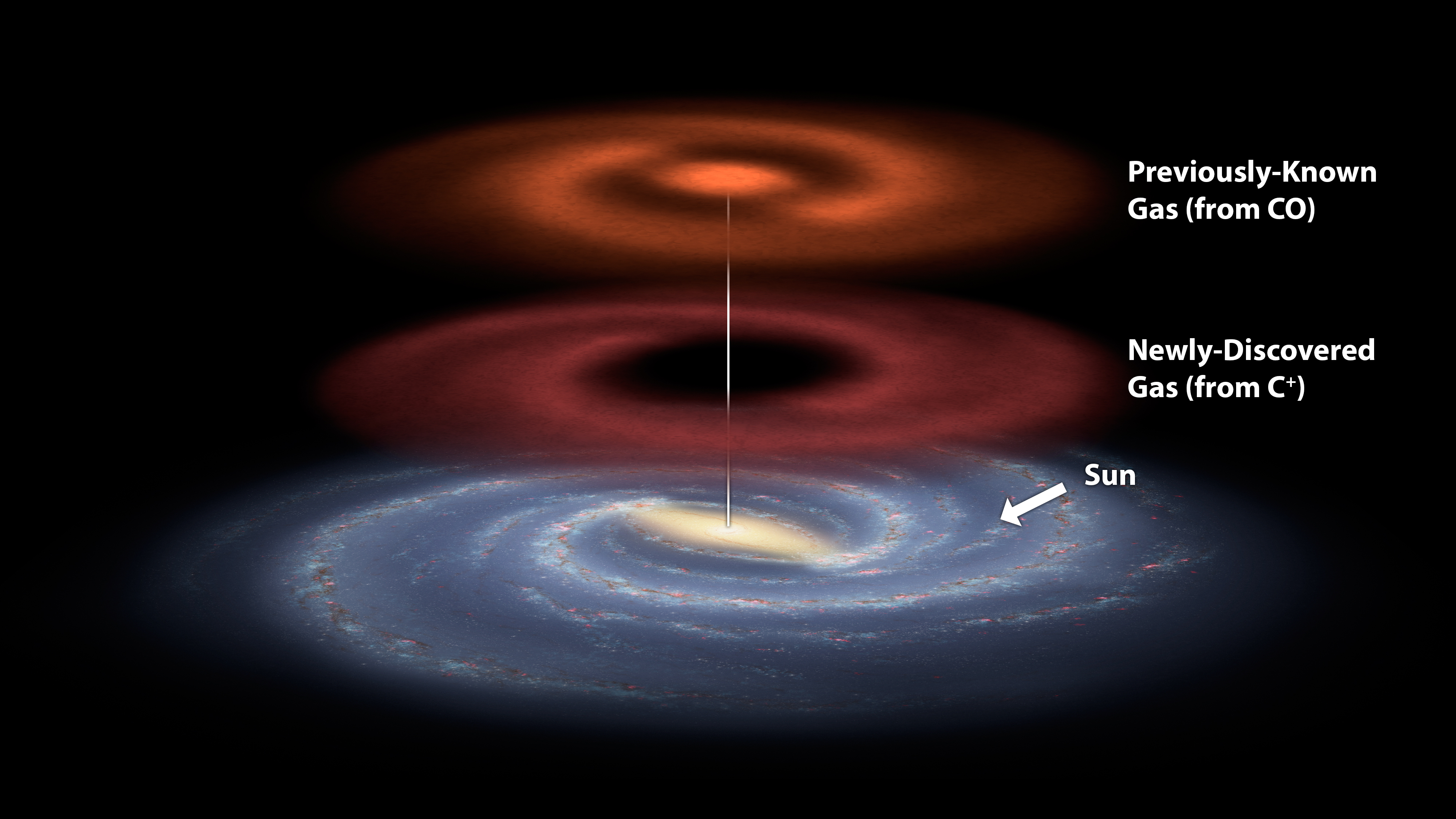 This illustration shows a newfound reservoir of stellar fuel discovered by the Herschel space observatory (red). Stars are formed out of pools of gaseous hydrogen molecules. To locate these pools, astronomers have historically looked for carbon monoxide (CO), which is co-located with the hydrogen gas (orange). But this tracer molecule does not lead astronomers to all of the star-making material in our galaxy. By using Herschel to map ionized carbon (C+), scientists were able to find additional reservoirs of the hydrogen gas.
