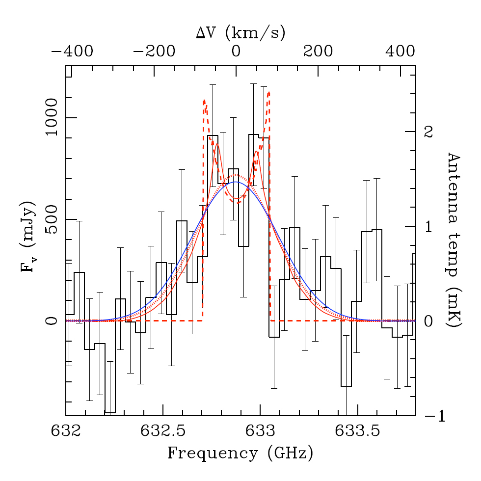 Herschel spectrum for SDSS J120602.09+514229.5 (the Clone). Here, the data are noisier than for S0901 and the emission line of ionized carbon (at 158 micrometres) can be fitted in a number of ways. The dashed red line and the solid red line show double-peaked profiles that indicate little turbulence in the galaxy. The red dotted line and the blue solid line show models in which turbulence plays a dominant role in the galaxy. Statistically, the best fit is the solid red line, which is double peaked.