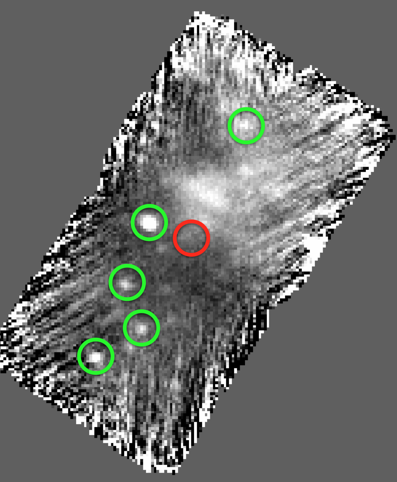 This 160 μm PACS map of the region of sky containing the Solar System object (248835) 2006 SX368 (position indicated with the red circle) demonstrates one of the strengths of the PACS point source catalogue: from the observation made by PACS, a pair of 70 μm and 160 μm maps were created for the purpose of studying this minor planet. Although the target object was too faint at 160 μm to be detected a number of other celestial sources (indicated with the green circles) were found within the field of view – these had not been catalogued before.