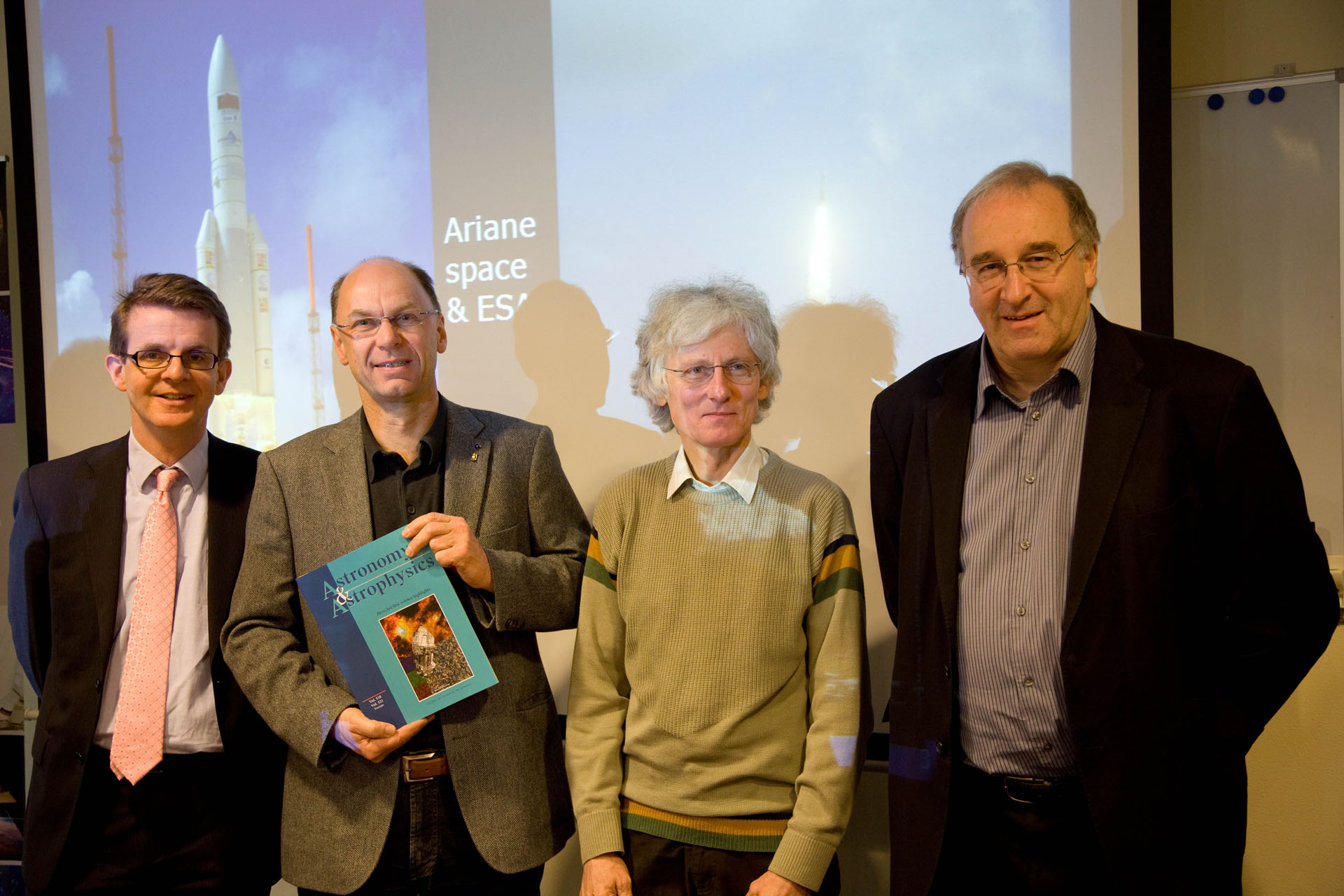 From left to right: Frank Helmich (HIFI Principal Investigator), Göran Pilbratt (ESA Herschel Project Scientist), Albrecht Poglitsch (PACS Principal Investigator), and Matt Griffin (SPIRE Principal Investigator).