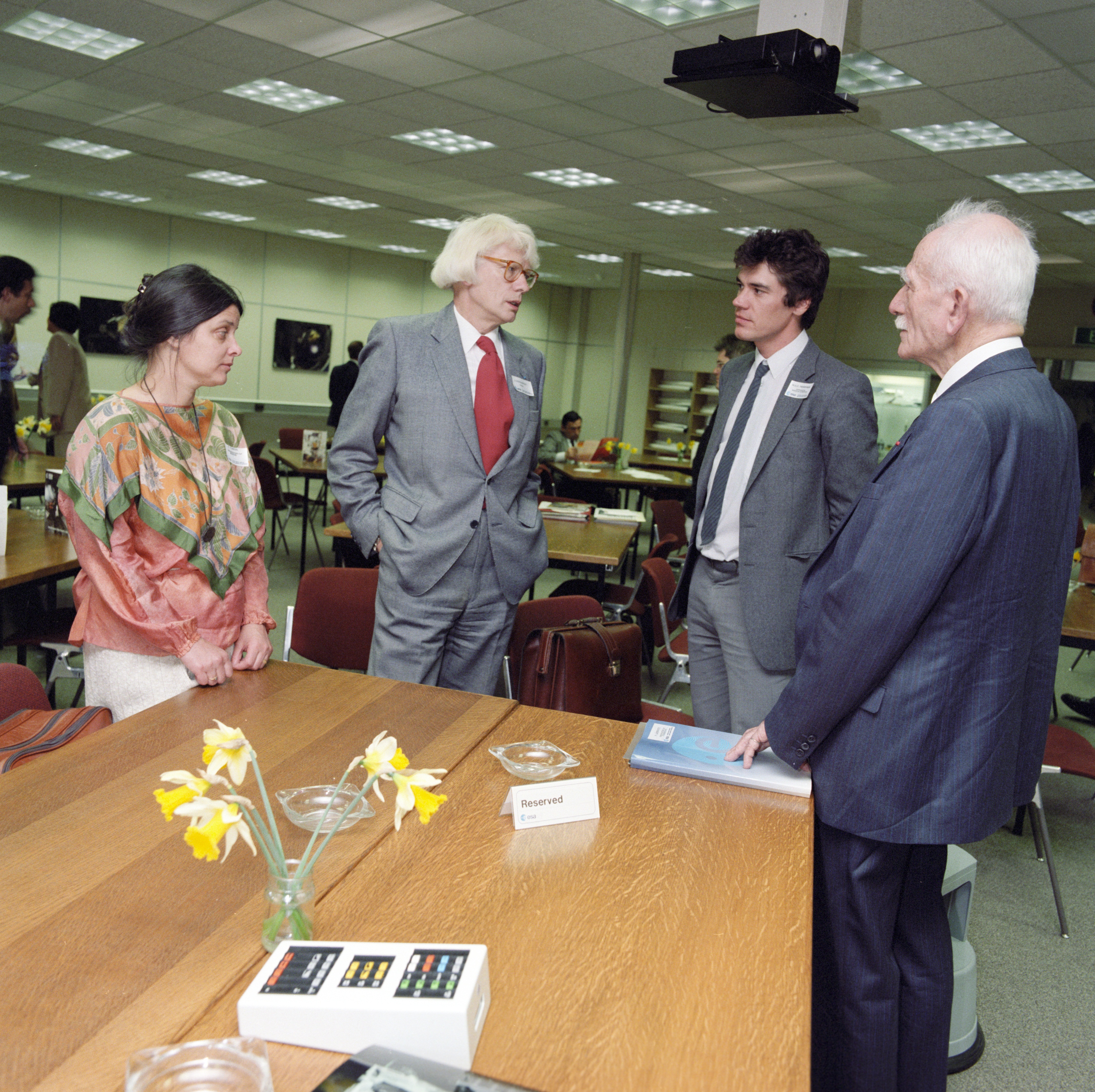 From left to right: Catherine Turon, Jean Kovalevsky, Michael Perryman and Pierre Lacroûte chat at the International Hipparcos Press Conference, 11 April 1988.