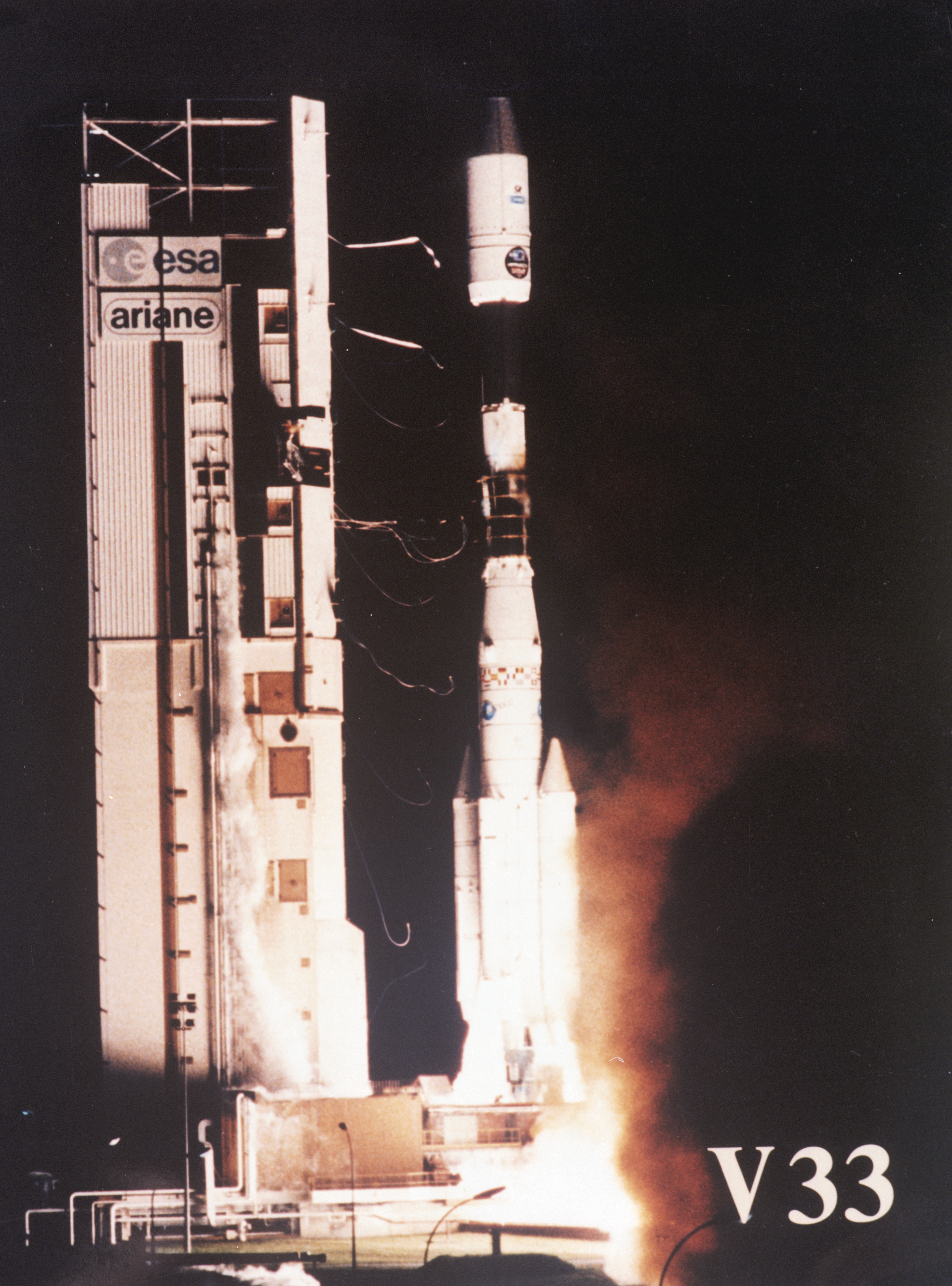 The Ariane-4 V33 launch of 8 August 1989 carried ESA's Hipparcos astrometry mission and Germany's TV-Sat-2 direct broadcast satellite.