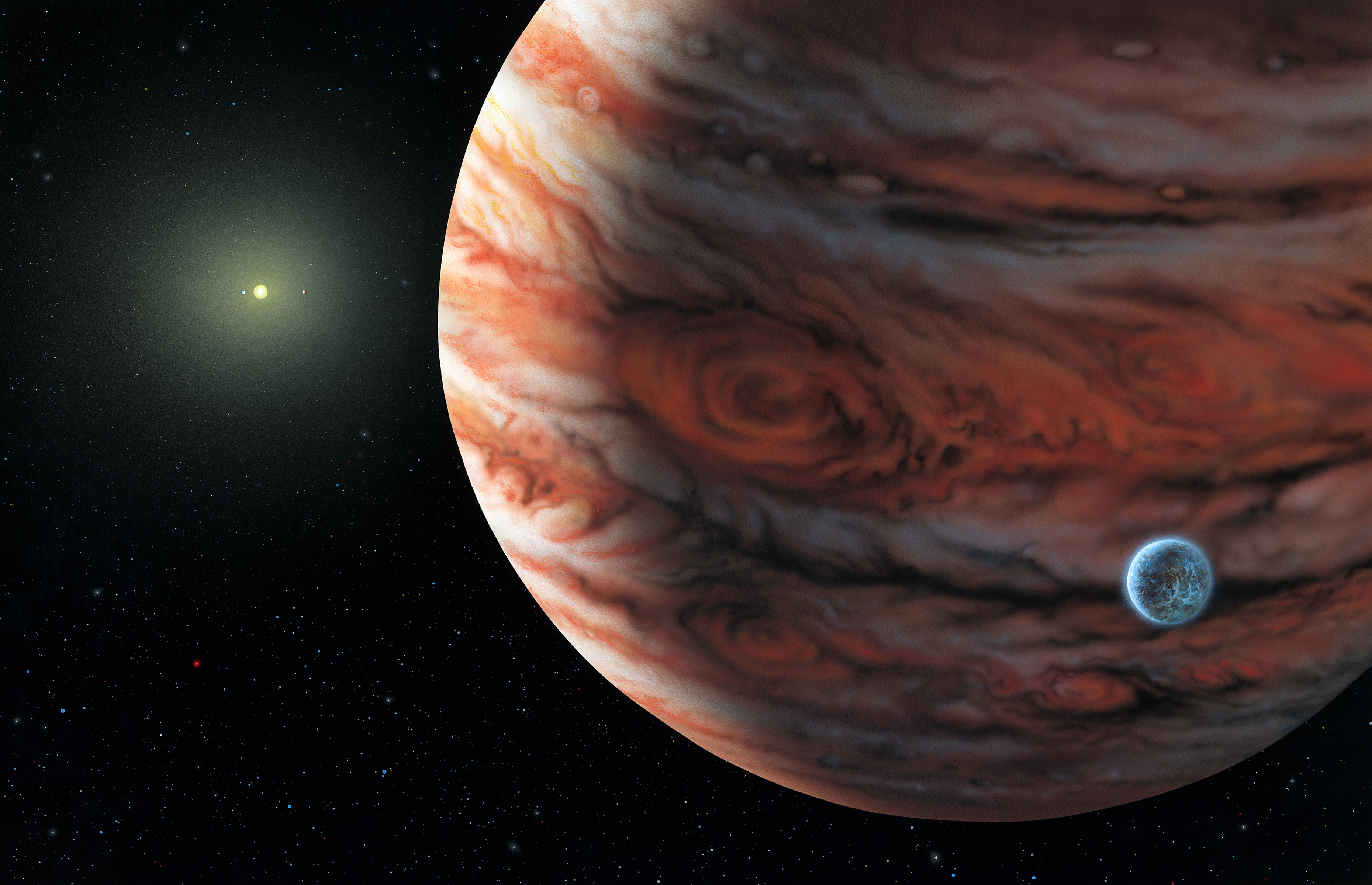 This illustration shows a newly discovered Jupiter-like planet and its hypothetical moon (blue orb) circling the star 55 Cancri. A previously known large planet is just to the left of the star and a hypothetical Earth-like planet to the right of the star.