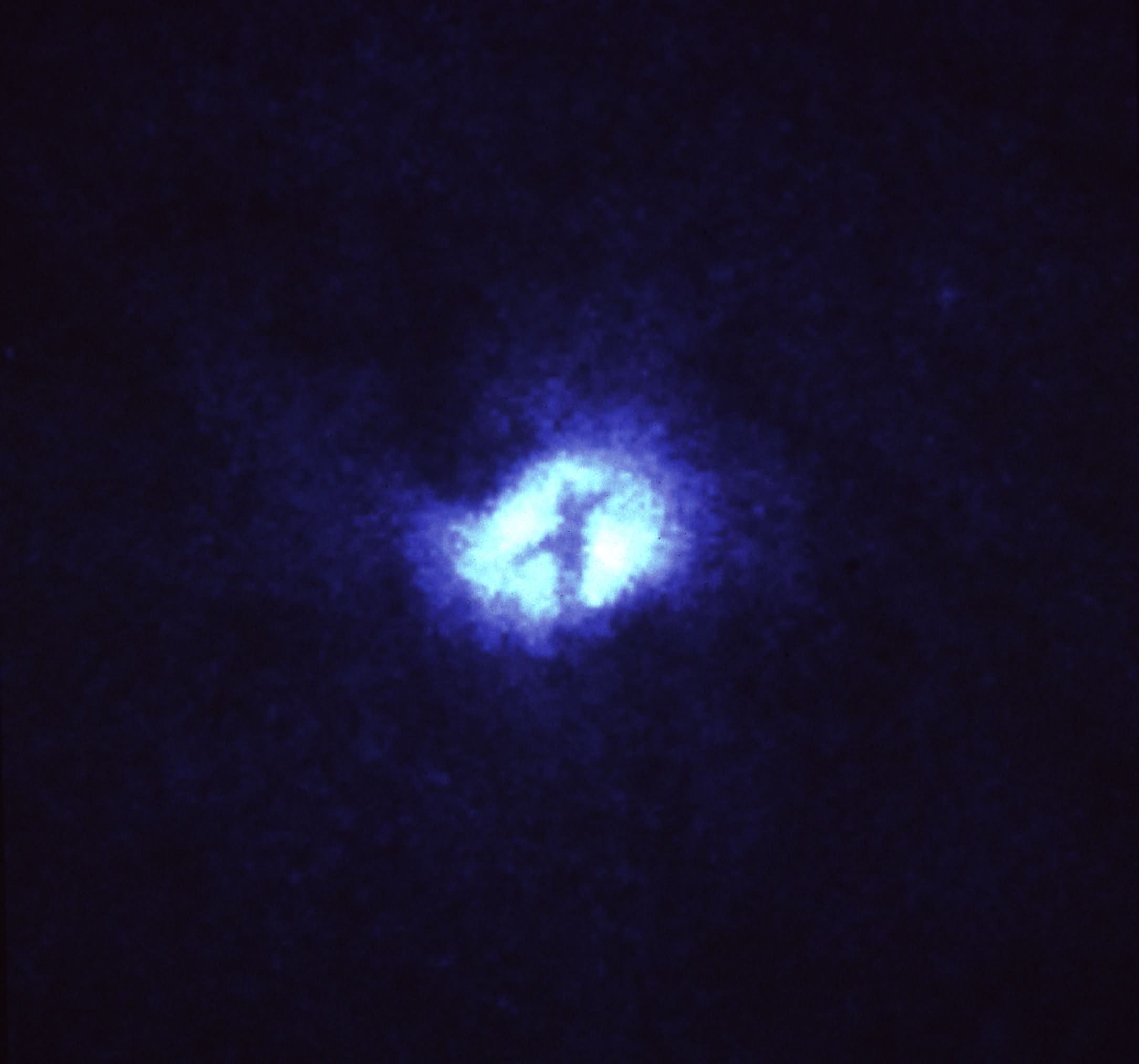 The "X" is due to absorption by dust and marks the exact position of a black hole which may have a mass equivalent to one-million stars like the sun. The darkest bar may be an edge-on dust ring which is 100 light-years in diameter. The edge-on torus not only hides the black hole and accretion disk from being viewed directly from earth, but also determines the axis of a jet of high-speed plasma and confines radiation from the accretion disk to a pair of oppositely directed cones of light, which ionize gas caught in their beam. The second bar of the "X" could be a second disk seen edge on, or possibly rotating gas and dust in MS1 intersecting with the jets and ionization cones.