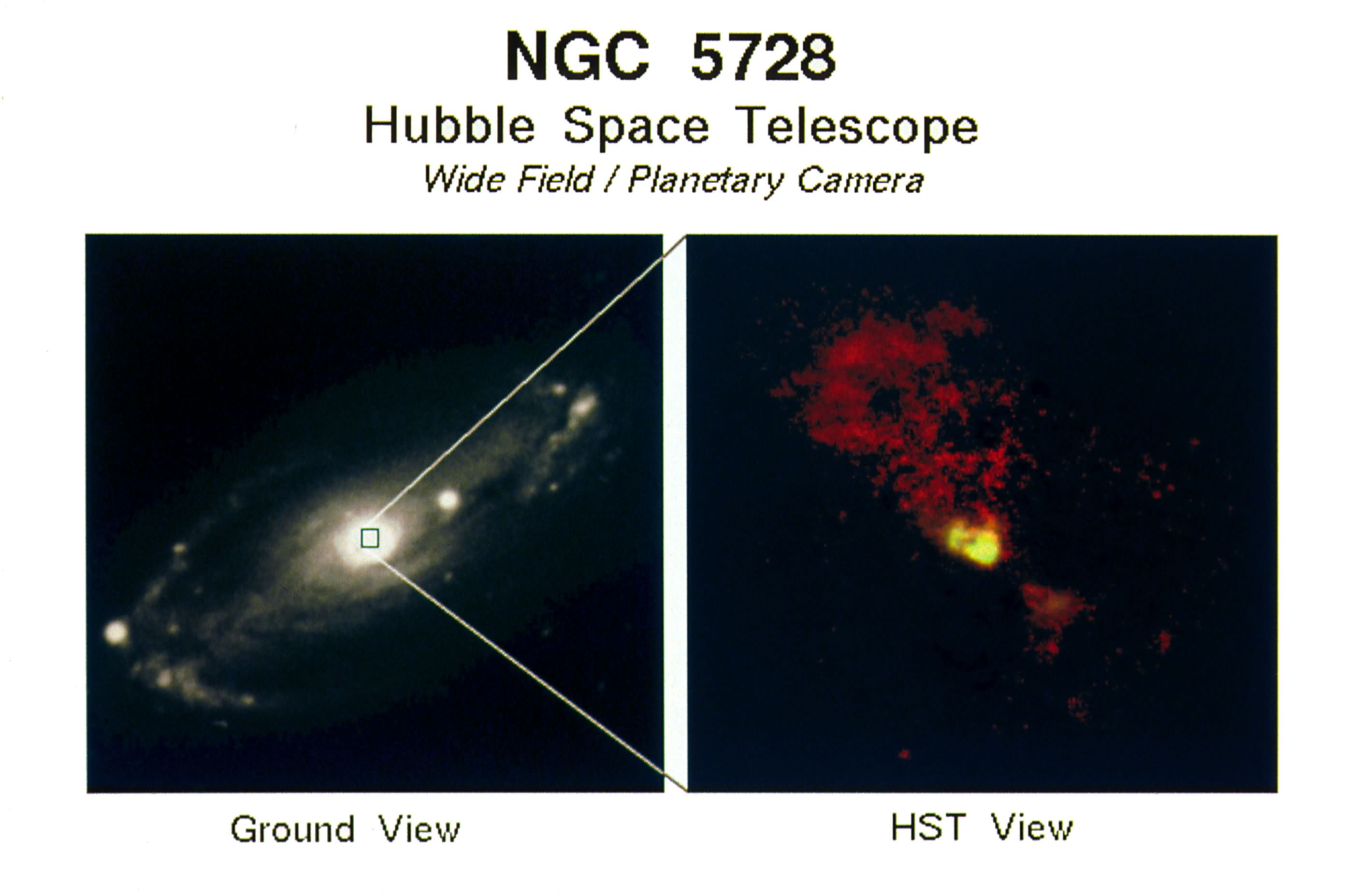 [Right] - A NASA Hubble Space Telescope (HST) view of the core of the barred spiral Seyfert galaxy NGC 5728 reveals a spectacular bi-conical beam of light that is ionizing the gas in the central region of the galaxy.
