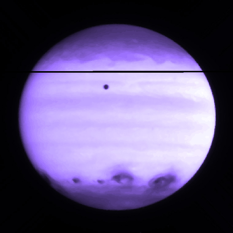 Ultraviolet image of Jupiter taken by the Wide Field Camera of the Hubble Space Telescope. The image shows Jupiter's