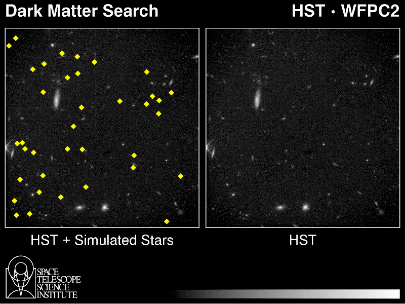 A Hubble Space Telescope image of a randomly selected area of sky taken to search for faint red stars that might constitute dark matter in our Milky Way Galaxy. (Dark matter is material of an unknown type that makes up most of the mass of our galaxy).
