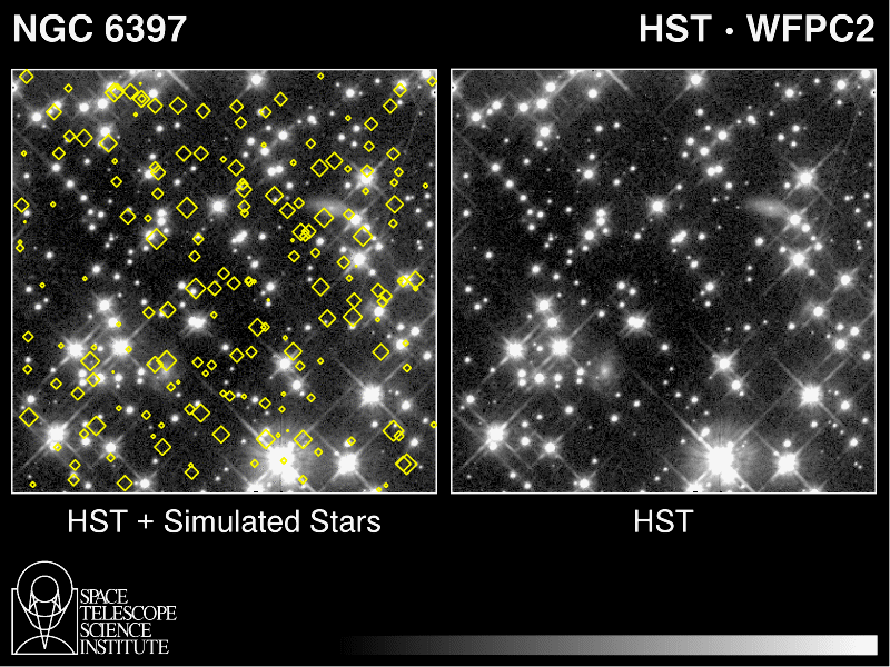 A Hubble Space Telescope image of a small region (1.4 light-years across) in the globular star cluster NGC 6397. Simulated stars (diamonds) have been added to this view of the same region of the cluster to illustrate what astronomers would have expected to see if faint red dwarf stars were abundant in the Milky Way Galaxy. The field would then contain 500 stars, according to theoretical calculations.