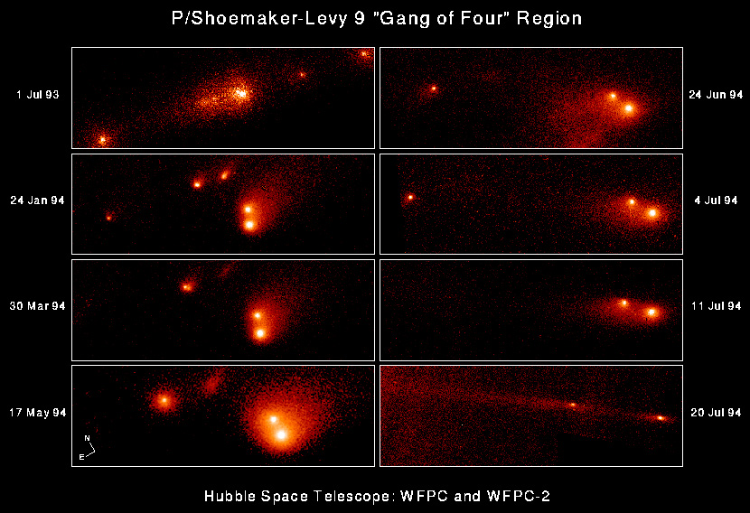 This series of eight NASA Hubble Space Telescope "snapshots" shows the evolution of the P-Q complex, also called the "gang of four" region, of comet Shoemaker-Levy 9.