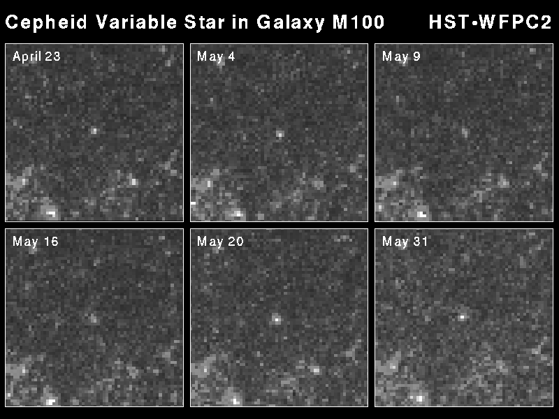 This sequence of images taken with the Hubble Space Telescope chronicles the rhythmic changes in a rare class of variable star (located in the center of each image) in the spiral galaxy M100. This class of pulsating star is called a Cepheid Variable. The Cepheid in this Hubble