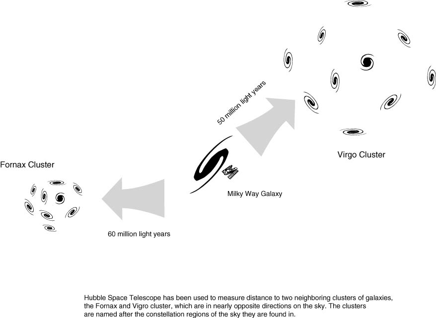 (Illustration) Hubble Space Telescope has been used to measure the distance to two neighboring clusters of galaxies, the Fornax and Virgo Cluster, which are in nearly opposite directions on the sky.