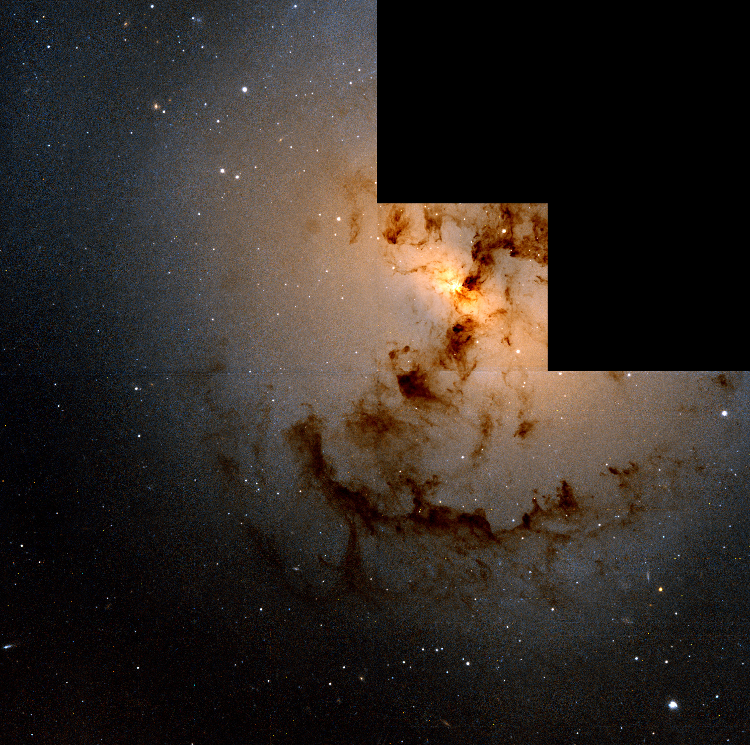 This beautiful, eerie silhouette of dark dust clouds against the glowing nucleus of the elliptical galaxy NGC 1316 may represent the aftermath of a 100 million year old cosmic collision between the elliptical and a smaller companion galaxy.