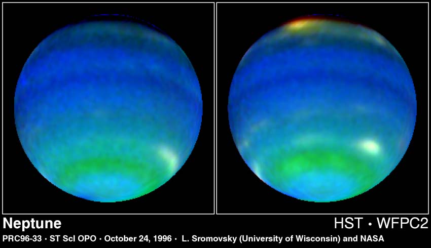Taken Aug. 13, 1996, with Hubble's Wide Field Planetary Camera 2, these composite images blend information from different wavelengths to bring out features of Neptune's blustery weather.