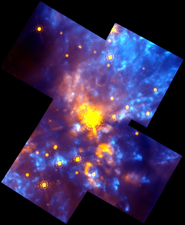 and scattering the intense starlight, appear yellow-orange. Emission by