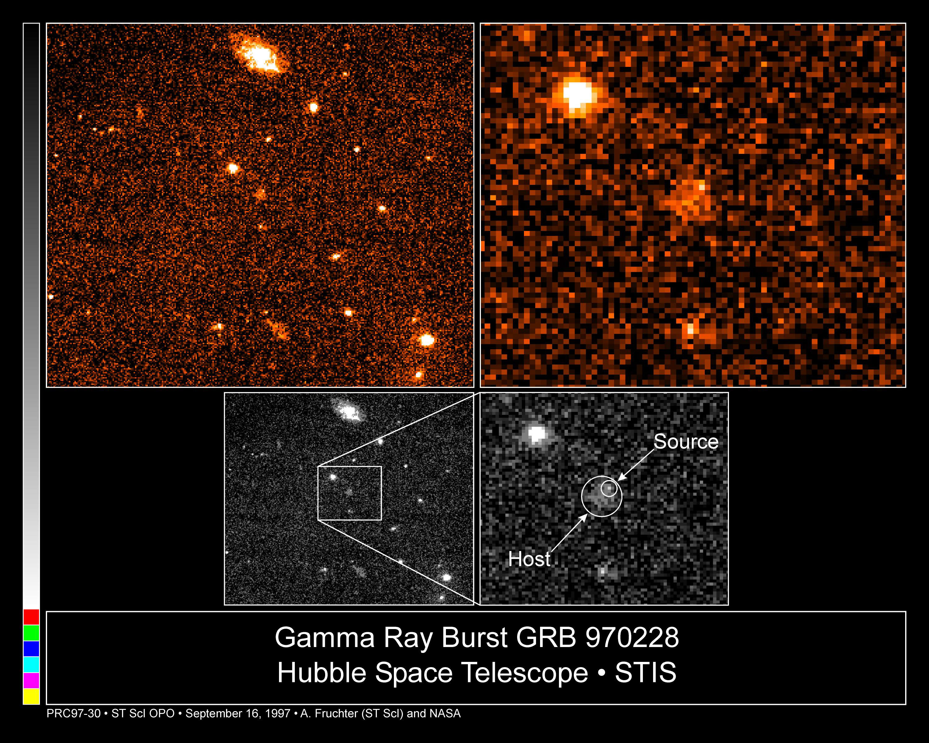 Though the visible component has faded to 1/500th its brightness (27.7 magnitude) from the time it was first discovered by ground- based telescopes last March (the actual gamma-ray burst took place on February 28), Hubble continues to clearly see the fireball and discriminated a surrounding nebulosity (at 25th magnitude) which is considered a host galaxy.