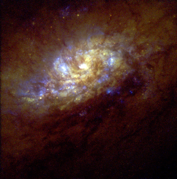 flurry of star birth at the galaxy's core. The star clusters (blue) can