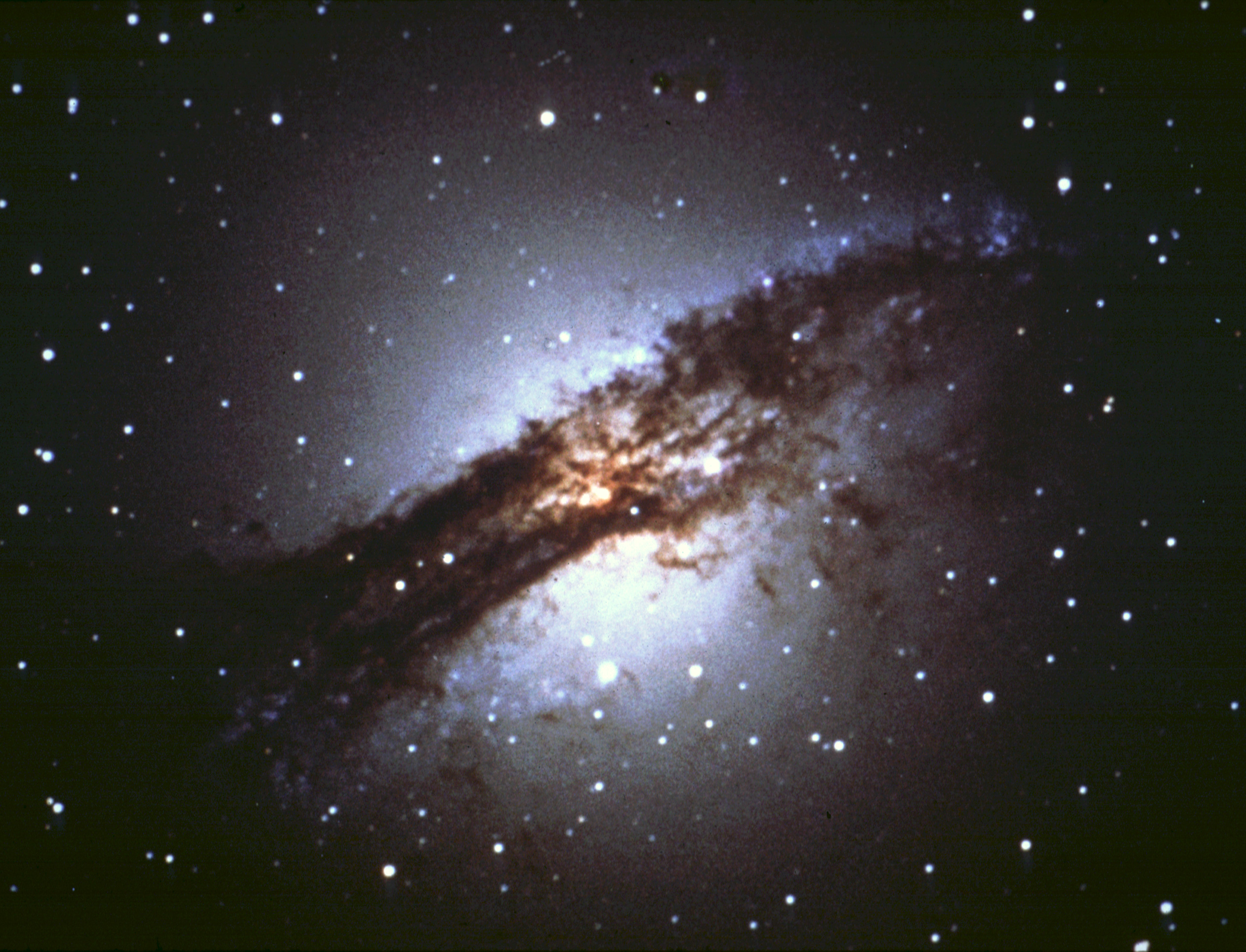 NGC5128 is a type E0 peculiar elliptical galaxy in the constellation Centaurus. This galaxy is one of the most luminous and massive galaxies known and is a strong source of both radio and X-ray radiation. It acquired its alternative designation of Centaurus A precisely because it's the strongest radio source in Centaurus. Some theories suggest that the nucleus is experiencing giant explosions involving millions of stars and that the dark band across the galactic disk is material being ejected outward: others suggest the band is debris from a smaller dusty galaxy that is being absorbed by Centaurus A. No doubt studies will continue. Photograph from the Cerro Tololo InterAmerican Observatory 4-meter Blanco telescope.