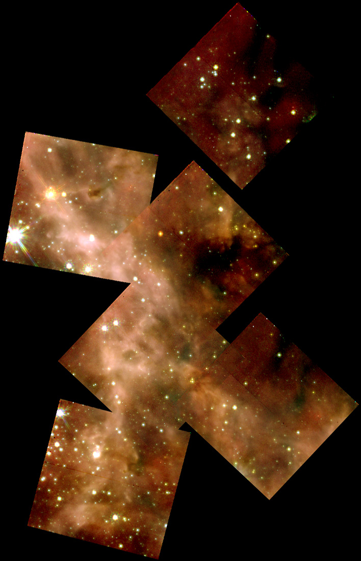 This picture, taken in visible light with the Hubble Space Telescope's Wide Field and Planetary Camera 2 (WFPC2), represents a sweeping view of the 30 Doradus Nebula. But Hubble's infrared camera - the Near Infrared Camera and Multi-Object Spectrometer (NICMOS) - has probed deeper into smaller regions of this nebula to unveil the stormy birth of massive stars. The montages of images in the upper left and upper right represent this deeper view. Each square in the montages is 15.5 light-years (19 arcseconds) across.