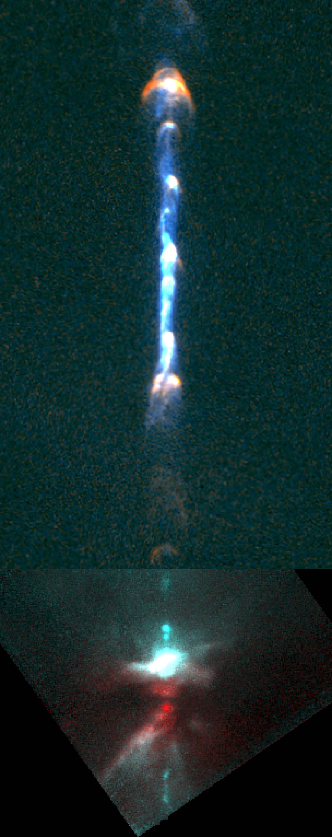This composite image, made with two cameras aboard NASA's Hubble Space Telescope, shows a pair of 12 light-year-long jets of gas blasted into space from a young system of three stars. The jet is seen in visible light, and its dusty disk and stars are seen in infrared light. These stars are located near a huge torus, or donut, of gas and dust from which they formed. This torus is tilted edge-on and can be seen as a dark bar near the bottom of the picture.
