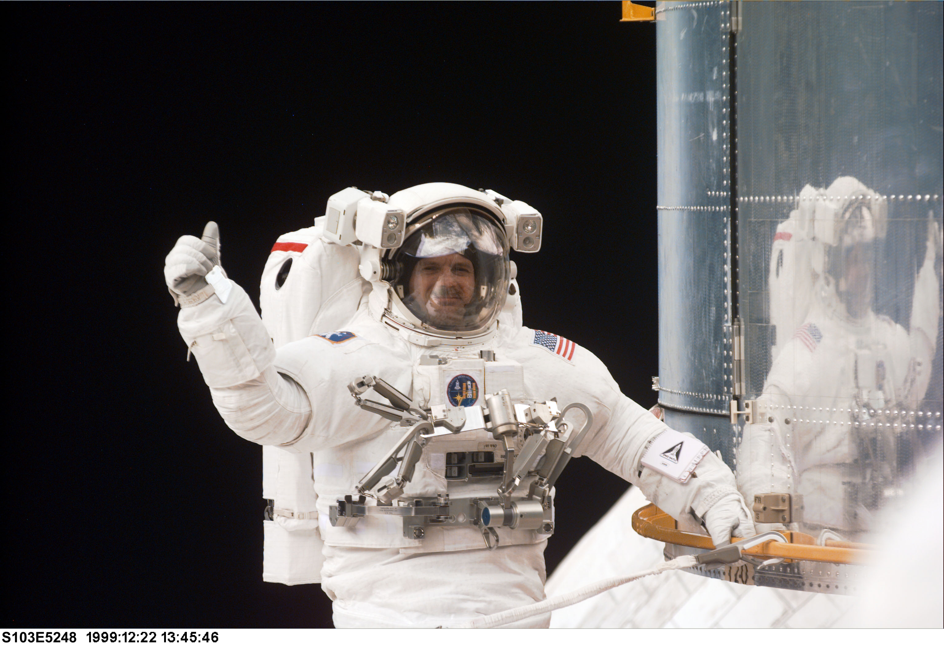 Astronaut Steven L. Smith, payload commander, waves to a crew mate located inside the Space Shuttle Discovery's cabin during the first spacewalk of NASA's third servicing visit to the Hubble Space Telescope (HST).