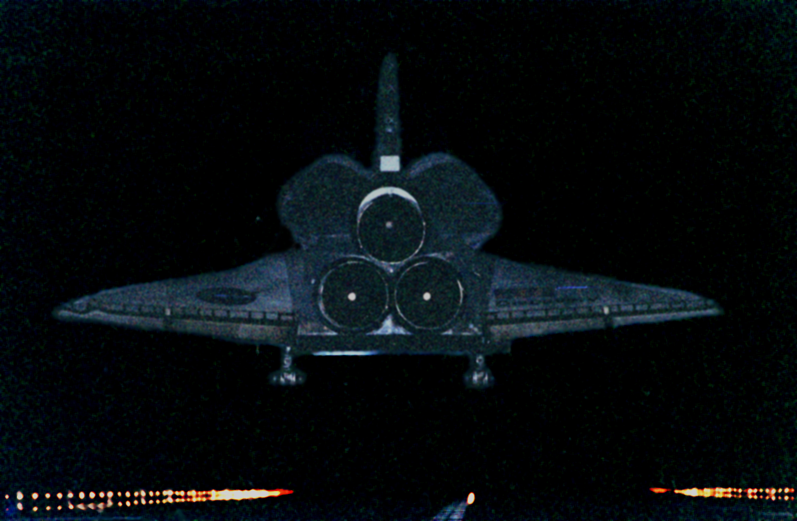 The orbiter Discovery looks like a blue ghost as it drops from the darkness onto lighted runway 33 at KSC's Shuttle Landing Facility. After traveling more than 3 267 000 miles on a successful eight-day mission to service the Hubble Space Telescope, the orbiter touches down at 00:00:47 UT 28/12/1999.