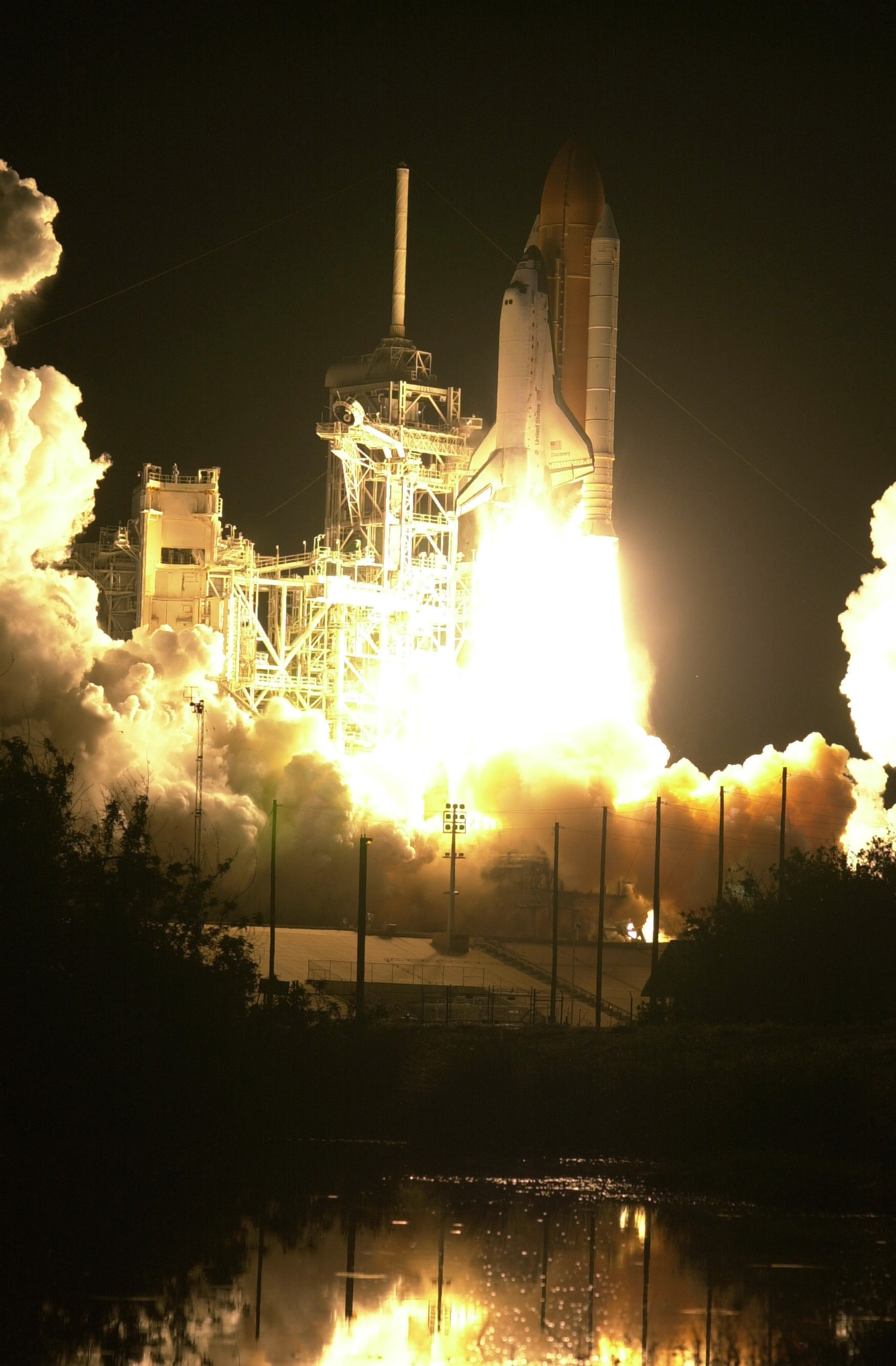 The clear night at the lakeside created a fantastic setting for the liftoff of the Space Shuttle Discovery.