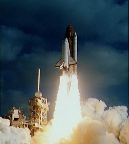 STS-31 Discovery, Orbiter Vehicle (OV) 103, nearly clear of the fixed service structure (FSS) tower rises above Kennedy Space Center (KSC) Launch Complex (LC) Pad 39B after liftoff at 12:33:51.0492 am (UT). An exhaust cloud produced by the solid rocket boosters (SRBs) covers the launch pad below. The top of the retracted rotating service structure (RSS) appears at the left. OV-103 atop the external tank (ET) and flanked by the SRBs heads into Earth orbit with the Hubble Space Telescope (HST) aboard.