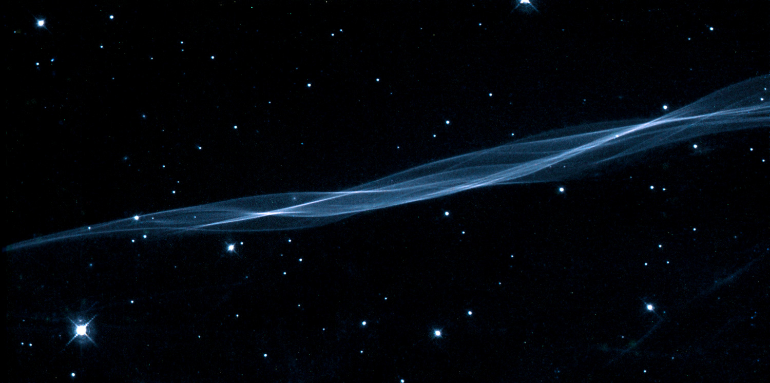This delicate Hubble Space Telescope image shows a tiny portion of the Cygnus loop, a supernova remnant in the constellation of Cygnus, the Swan. Measurements on this super-detailed image of a cosmic veil shows that the original supernova explosion took place only 5,000 years ago.